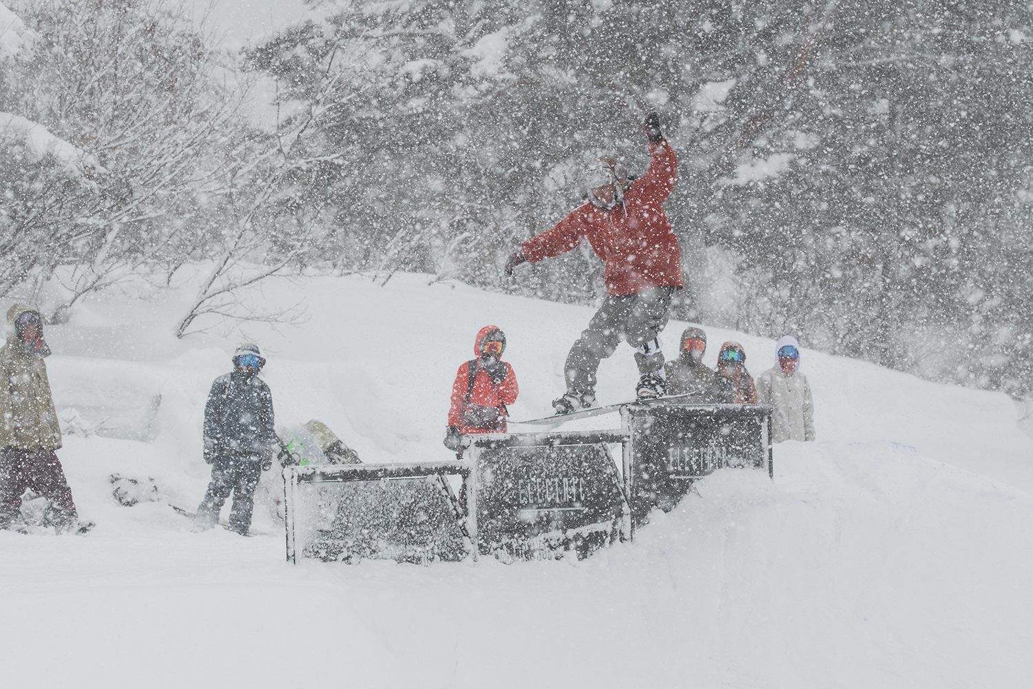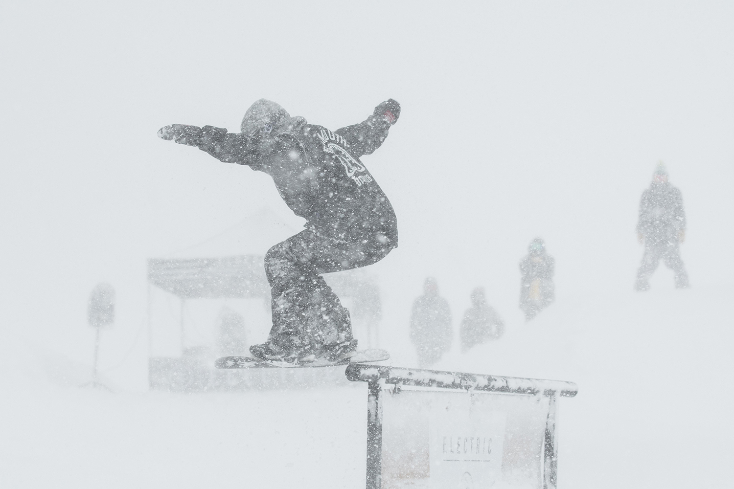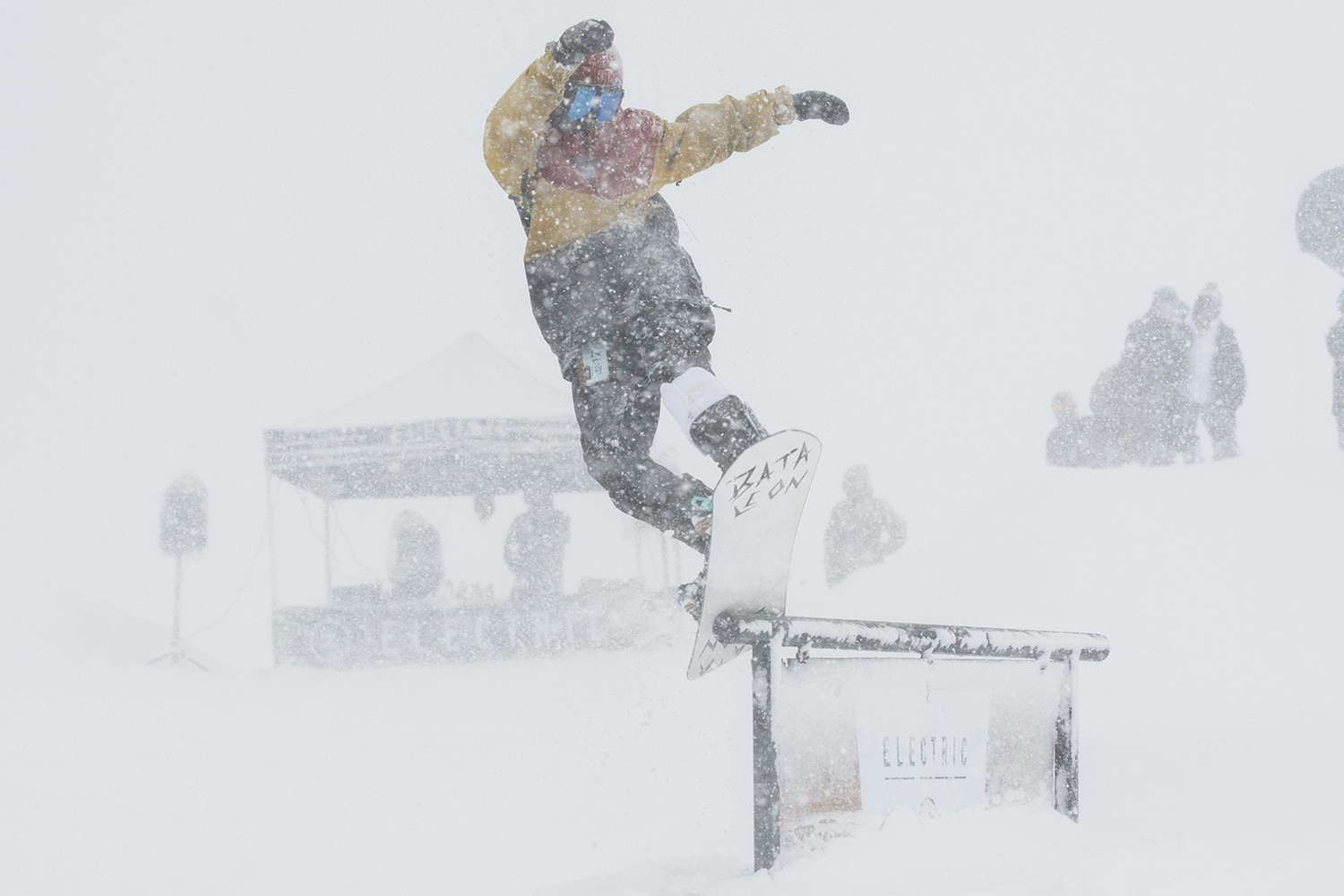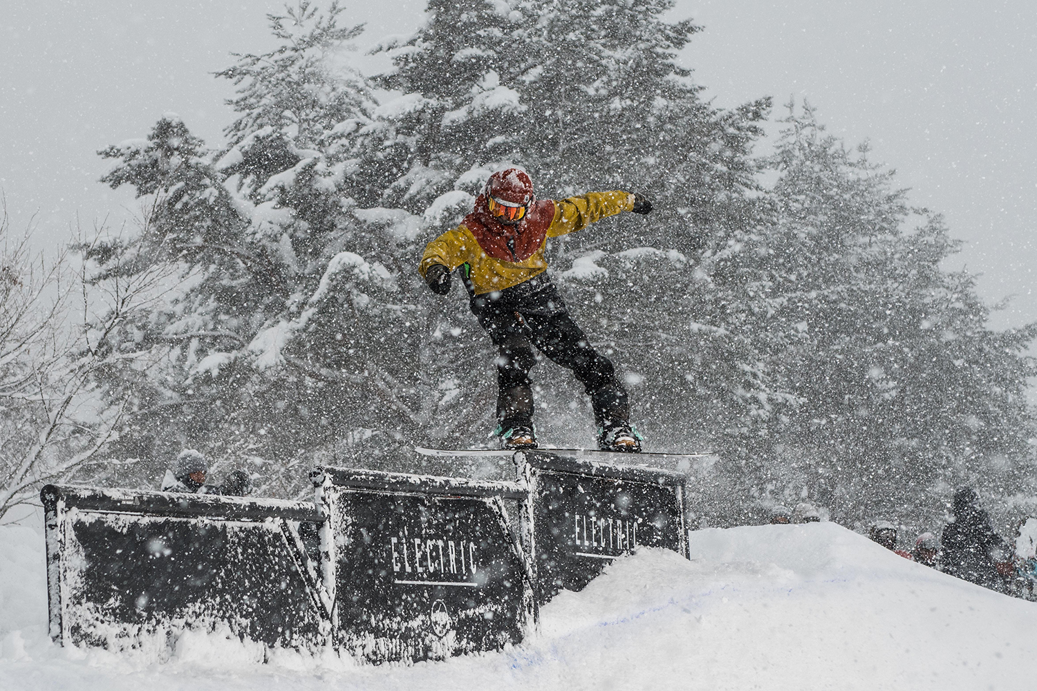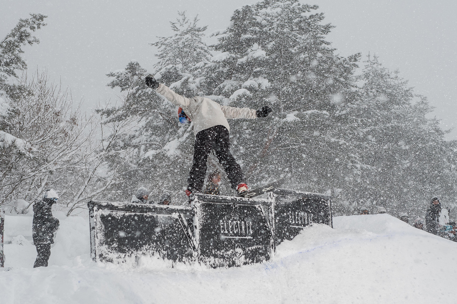 ジャムセッションがスタートし、滑りながら少しずつラインが見え始めた参加者たち。が、しかし。心配されていた天気予報は見事に的中してしまう。セッションが進んでいくと大粒の雪が降り出してきた。見る見るうちに、その降雪は勢いを増していく。そんな中、全国から集まったジブ自慢の参加者たちは磨き上げた自分のスタイルをELECTRICライダーたちに見せ付けるべく、大雪を吹き飛ばすアツいセッションを繰り広げた。