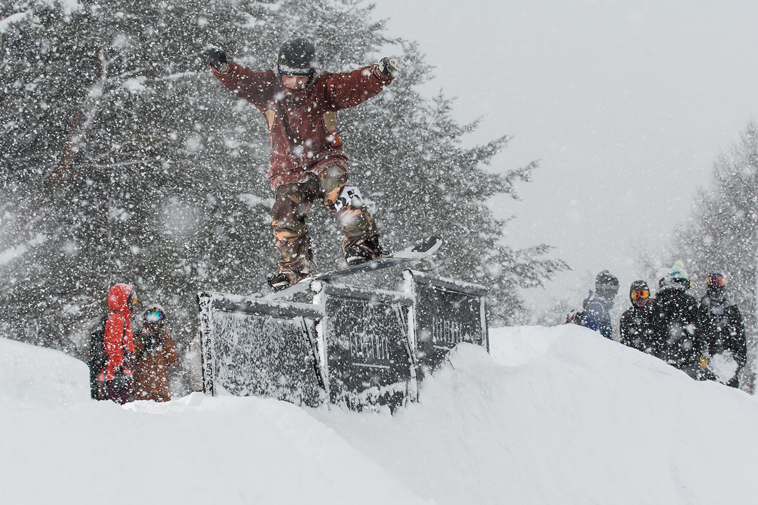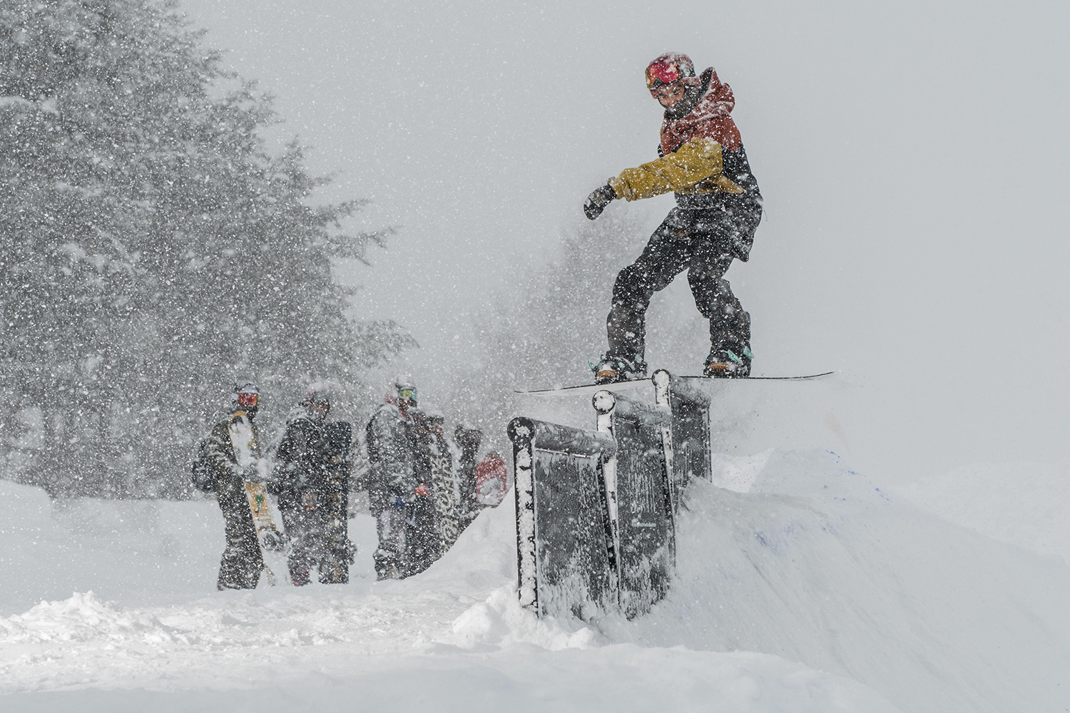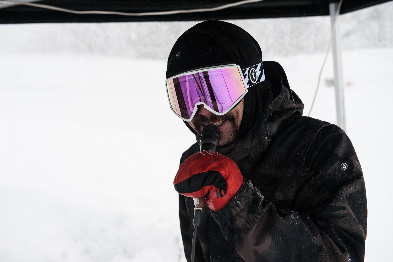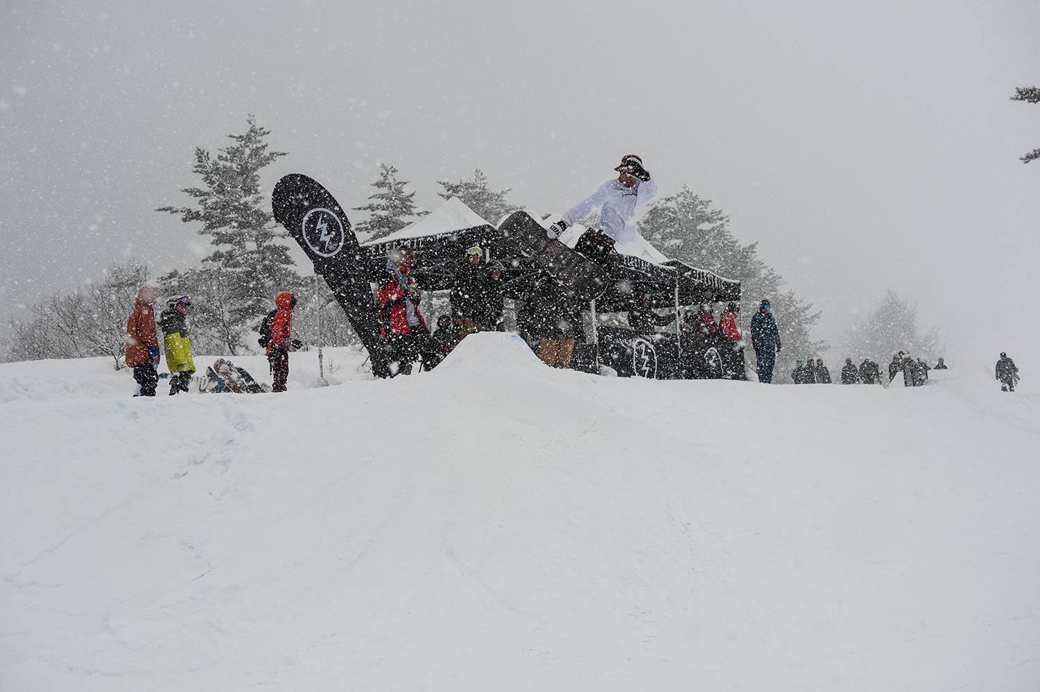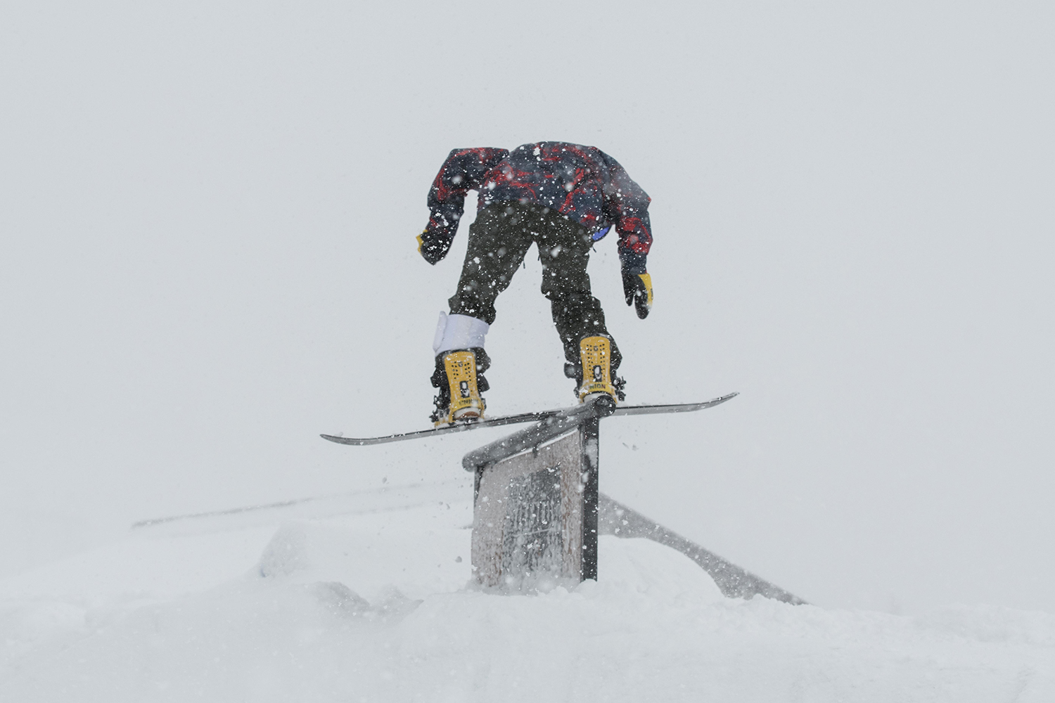 ジャムセッションがスタートし、滑りながら少しずつラインが見え始めた参加者たち。が、しかし。心配されていた天気予報は見事に的中してしまう。セッションが進んでいくと大粒の雪が降り出してきた。見る見るうちに、その降雪は勢いを増していく。そんな中、全国から集まったジブ自慢の参加者たちは磨き上げた自分のスタイルをELECTRICライダーたちに見せ付けるべく、大雪を吹き飛ばすアツいセッションを繰り広げた。
