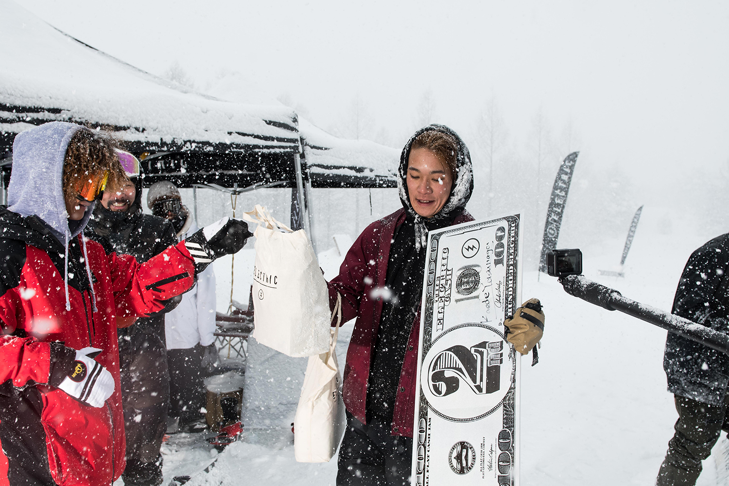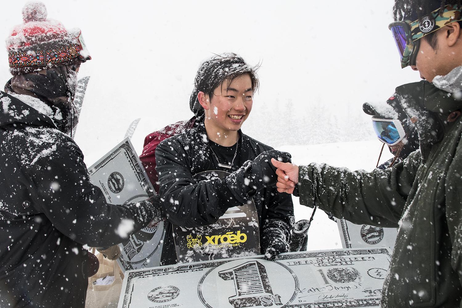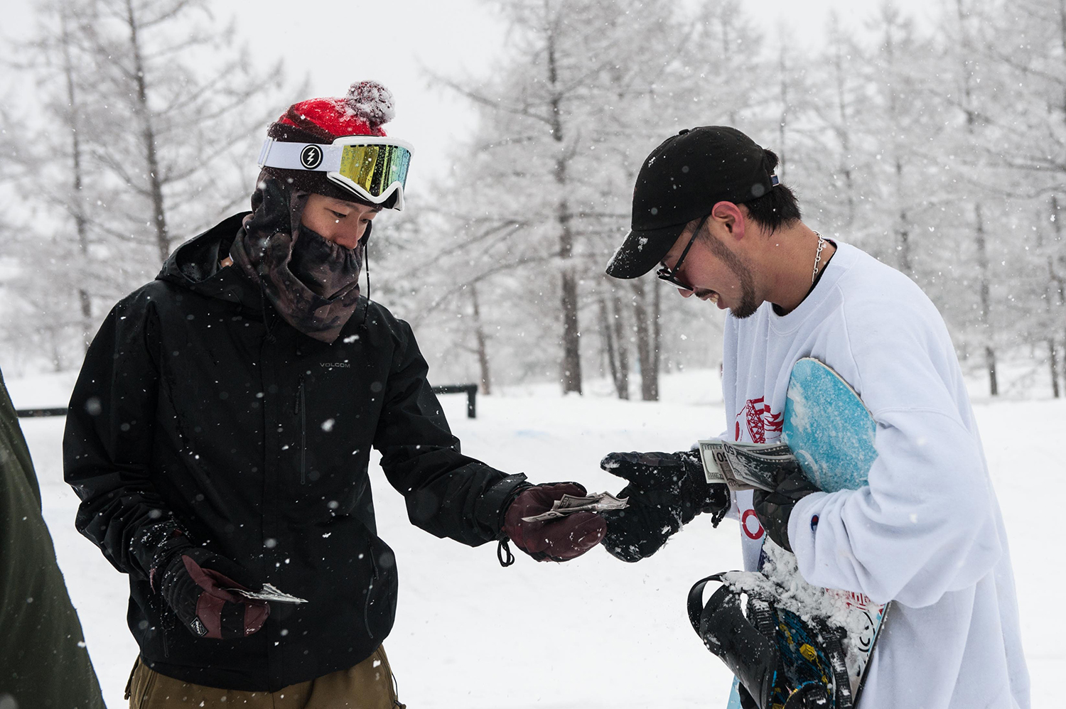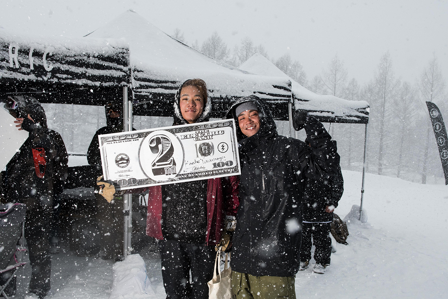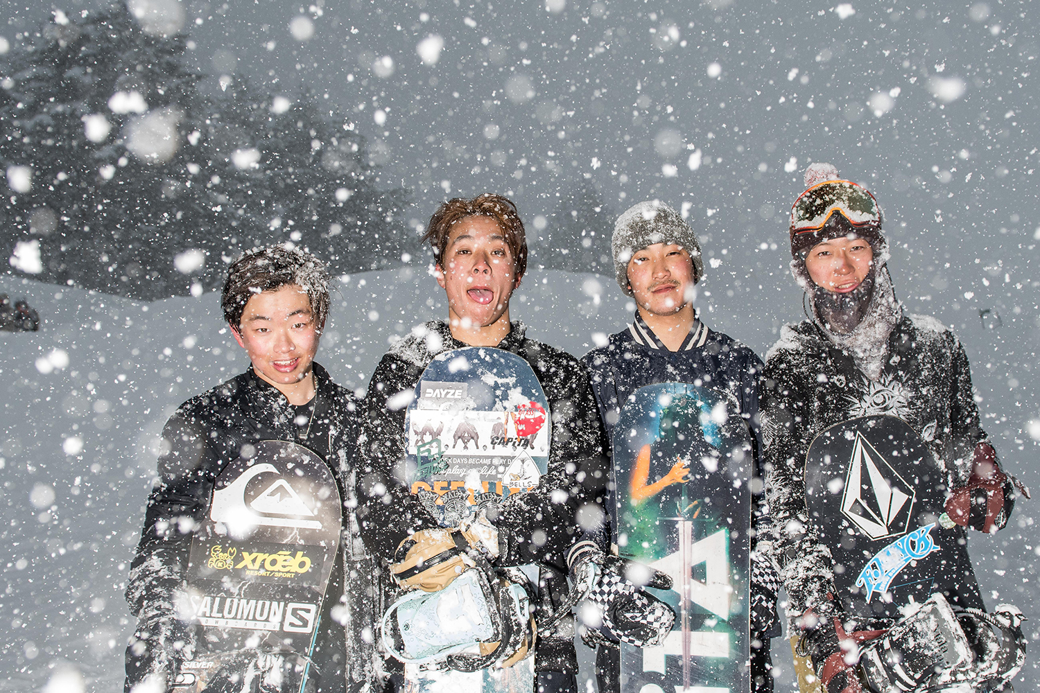 パイプ状のボトムには雪がたまり湿雪でスピードコントロールも難しい。より高度なラインどりが必要になっていく中、湯沢をベースに活動するMIZOUクルーの安永兄弟(楓と颯)は、クリエイティブなラインで巧みにRを使いこなしていた。ジブセクションをスタイリッシュに攻めると、ウォールやリップでバックフリップを披露する楓。ワンフットで三段レイルを攻め、エルボーレイルでトリッキーな360アウトをする颯。そんな各セクションを創造力豊かに攻める姿は印象に残った。また三段レイルのジブセクションで、完璧にボードをコントロールする山本コンラッド、そして全セクションで安定感のあるライディングを魅せた神宮寺 海斗が、誰よりもキャッシュを多く集め見事優勝を手にした。