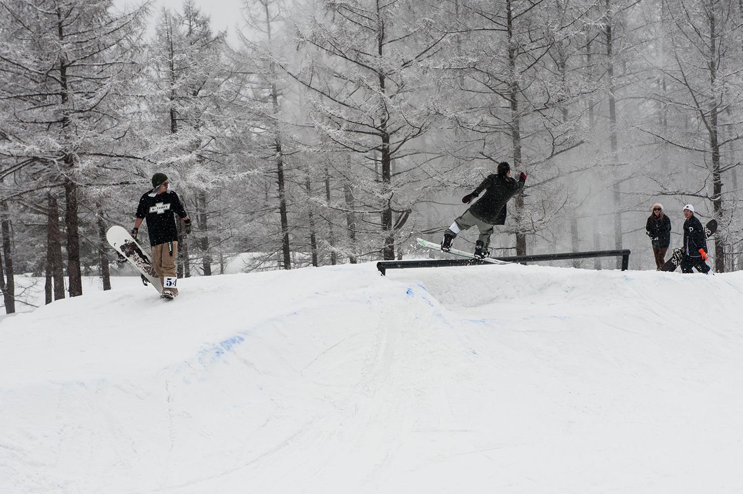 従来このイベントでは、ALL FLATなアイテム(ジブアイテム)を中心にレイアウトされてきたが、今回は浅めのパイプを新たに作り、それをベースに様々なジブアイテムが設置されている。まさにR(アール)地形とジブアイテムが融合された全く新しい特設パークだ。そのレイアウトから、Rをうまく使いながら流れの中でジブへエントリーしなくてはならない、総合滑走能力とクリエイティブさが求められるものだった。