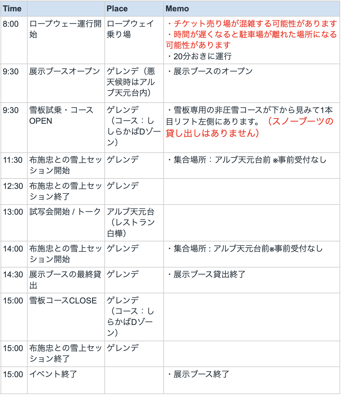 天候やゲレンデ状況により、内容・時間が変更となる場合があります