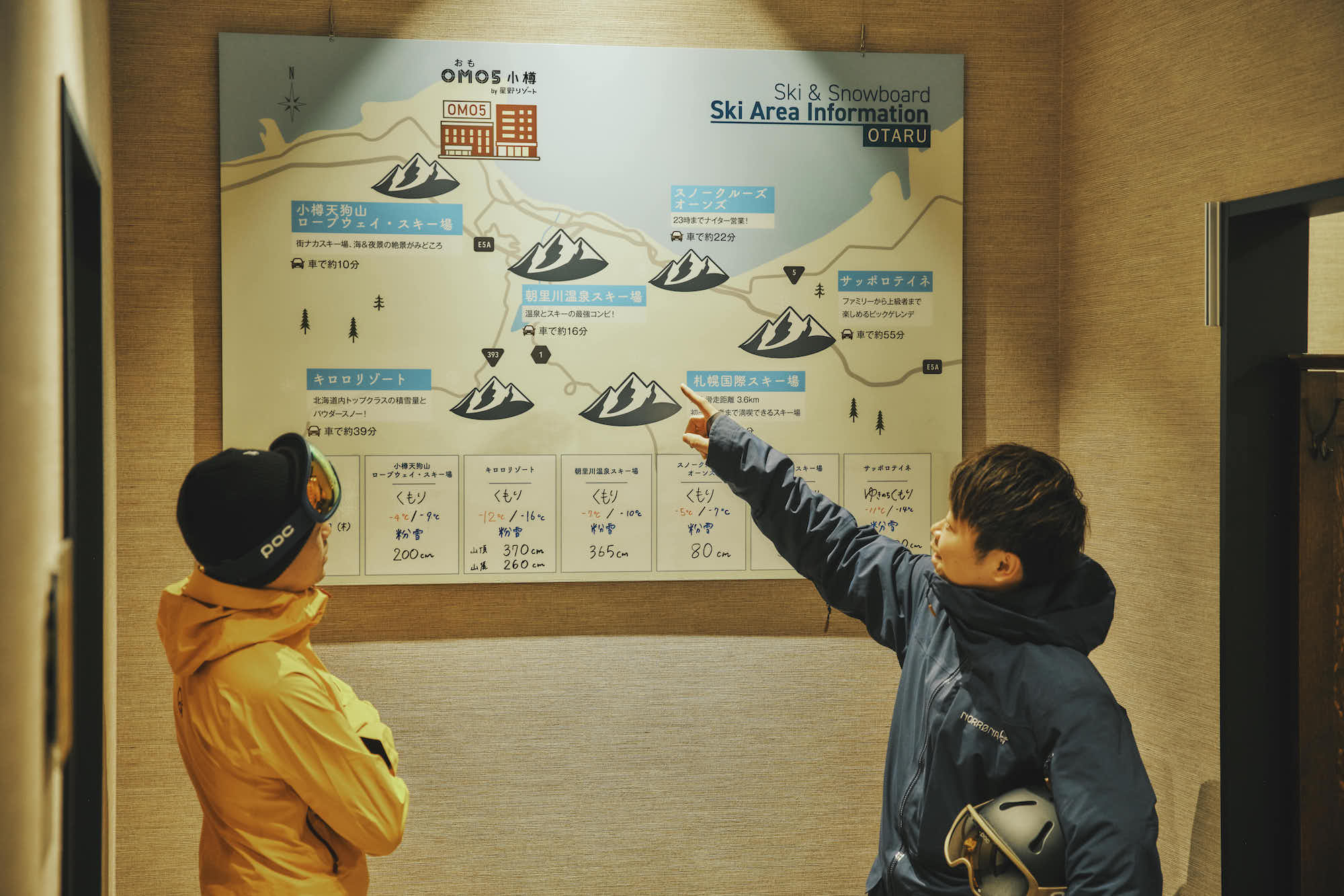 ロビーにある『ゲレンデ情報マップ』には『キロロスノーワールド』や『小樽天狗山スキー場』など『OMO5小樽』から車で1時間以内の距離にある6つのスキー場の「今」の情報が掲載されている。出発前にチェックすれば、天候や雪質、気温など、最新情報がひと目で分かる。間違いのないスキー場選びができるのだ。