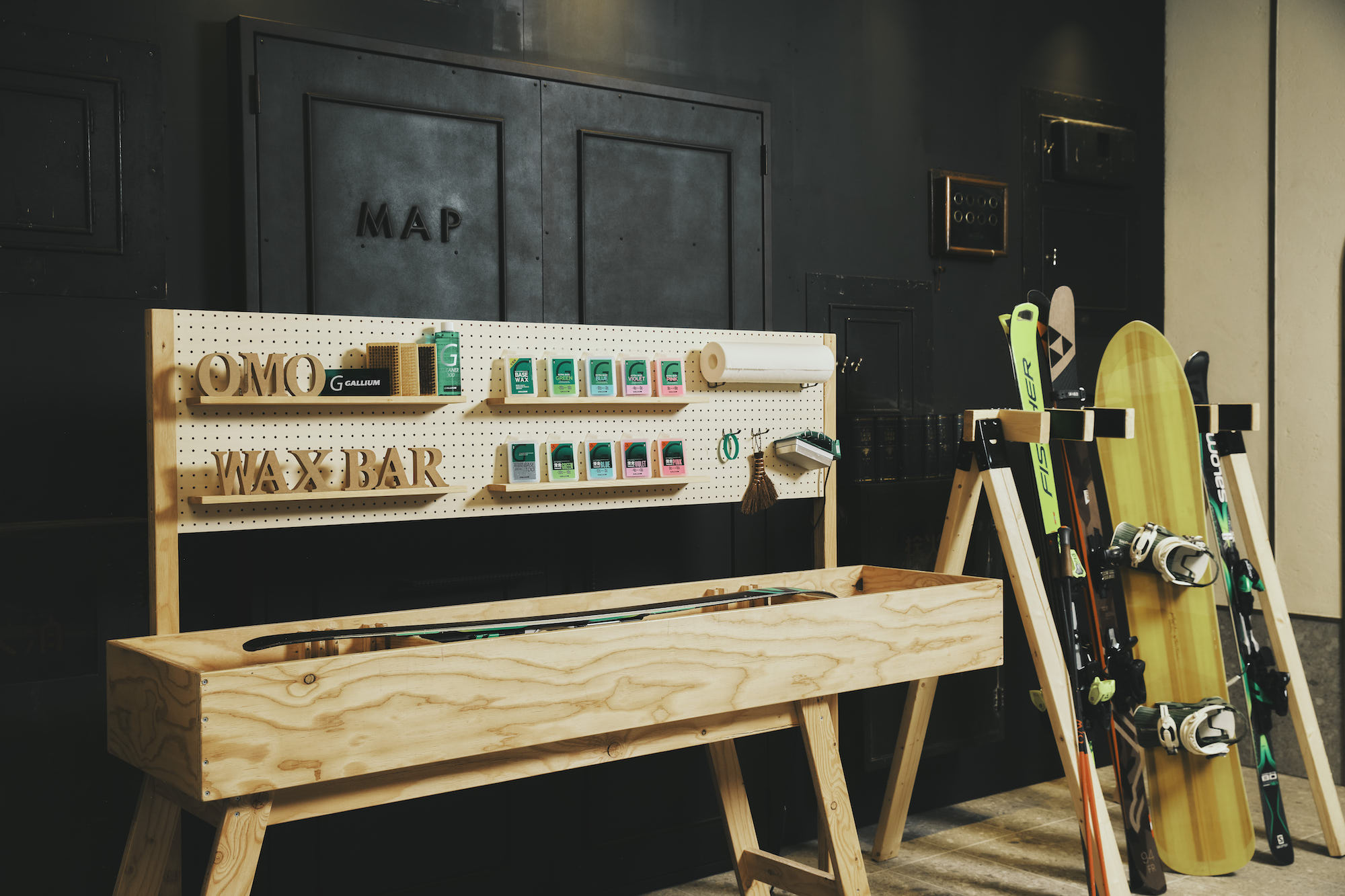 『OMO WAX BAR』には雪温+15℃~-30℃までに対応するワックスがずらりと揃い、北海道の読めないコンディションでもしっかり対応できる。ブラシ、スクレーパーなどのチューンナップ道具も揃っているから、手ぶらで来ても即ワクシング可能。しかも、24時間いつでも無料。「明日はパウダーだからフッ素少なめで」「気温が上がりそうだから固めのワックスで」──そんな細かいチューニングも、自分のタイミングでじっくりできる。