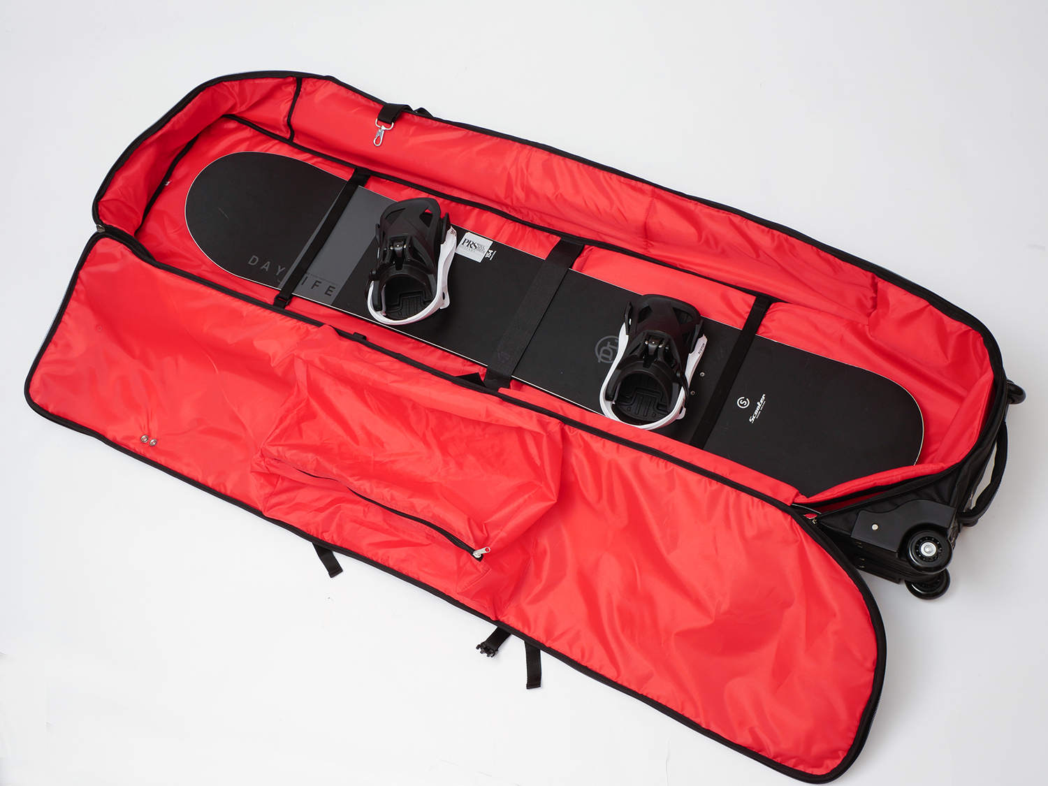 中央の大きな固定ポケットに着替えや小物を収納可能。ノーズ・テールは細め、中央部は幅広のベルクロテープでしっかりボードを固定できる。
