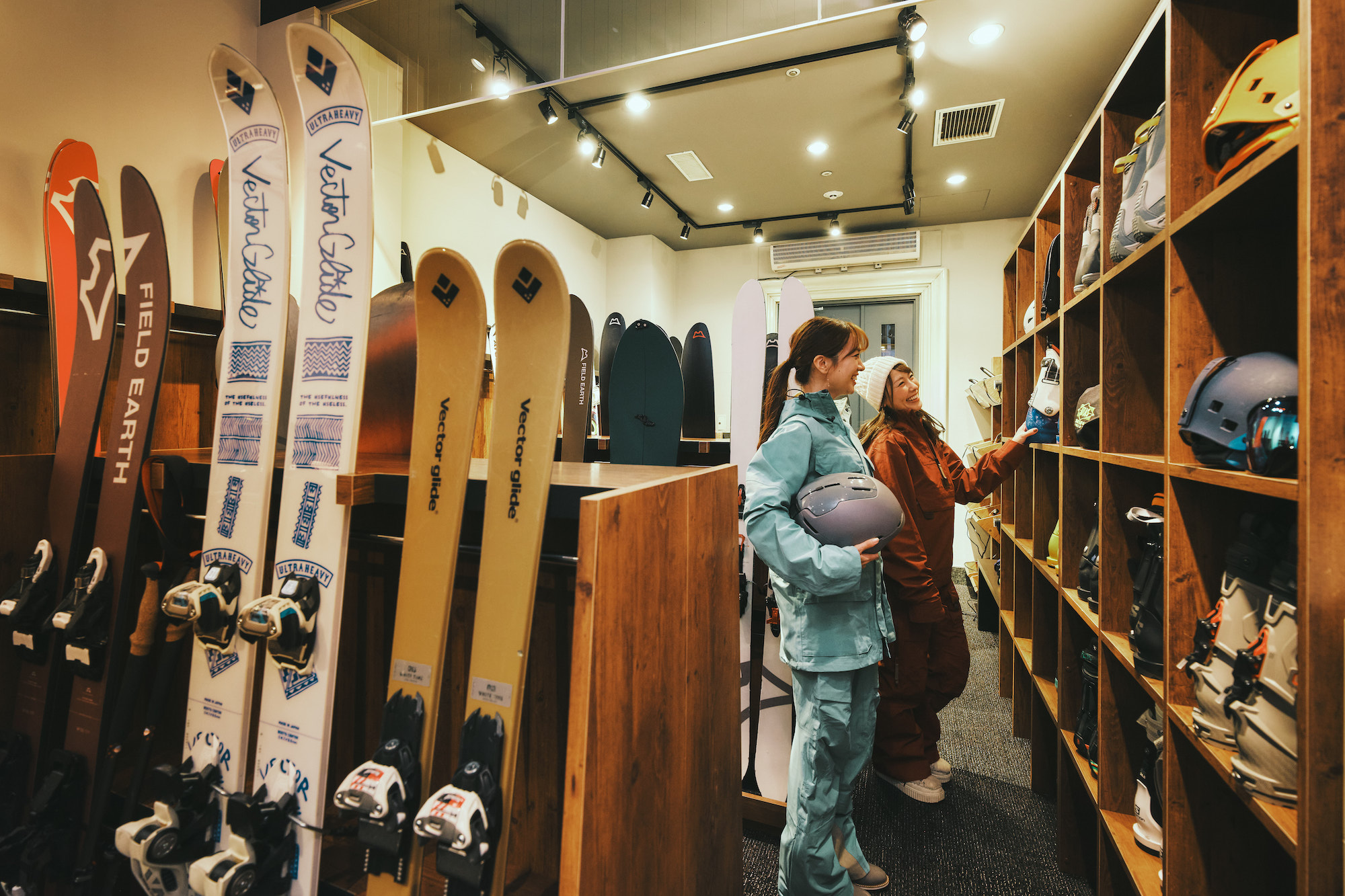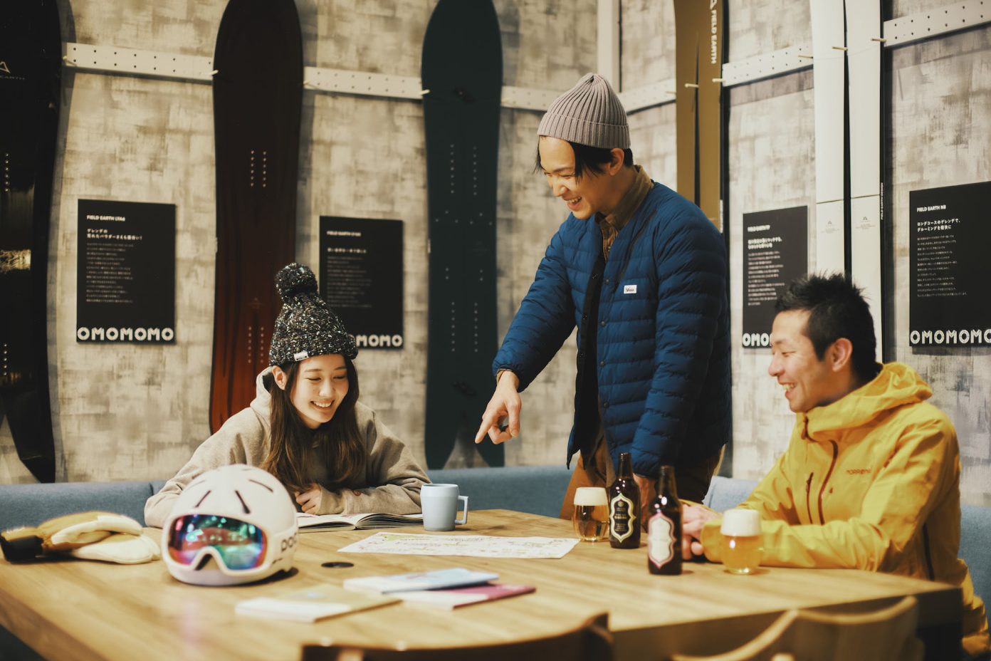 『OMOベース』には、大自然を多くの人々に感じてほしいという思いから誕生した旭川のスノーブランド『FIELD EARTH』のギアが飾られたラウンジが開設されている。「自然とつながることのできる物作り」のコンセプトをもとに、人の感覚を重視してデザインされたアイテムを見て、感じることができる。「スノーボードフィールドにマッチする道具とは?」など、ゆったりと思いを巡られせるのもいい。