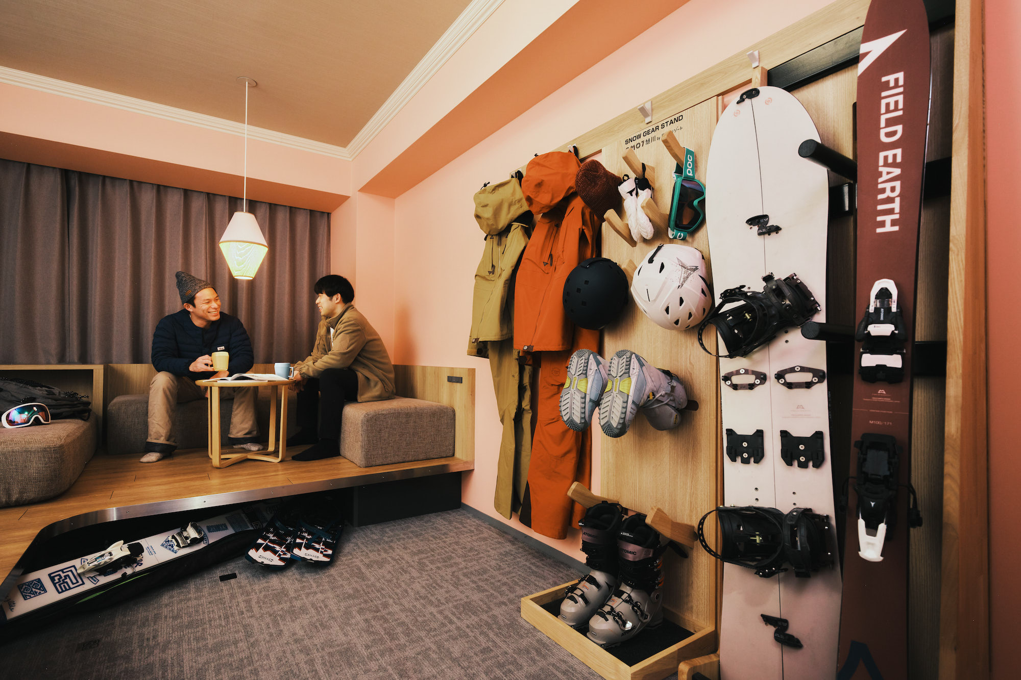 『OMO7旭川』にはスノーボーダーのための部屋がある。『スノーギアスタンドルーム』がそれだ。文字通り部屋には──日本五大家具メーカーのひとつである『旭川家具』と『OMO7旭川』が共同開発した──オリジナルギアスタンドがあり、そこでボードやグローブ、ヘルメットなど、自分の道具を保管・乾燥させることができる。スペースも広くとられており、ソファやベッドもゆったりしている。そこはいい明日を夢想するスノーボーダーのための特別室だ。