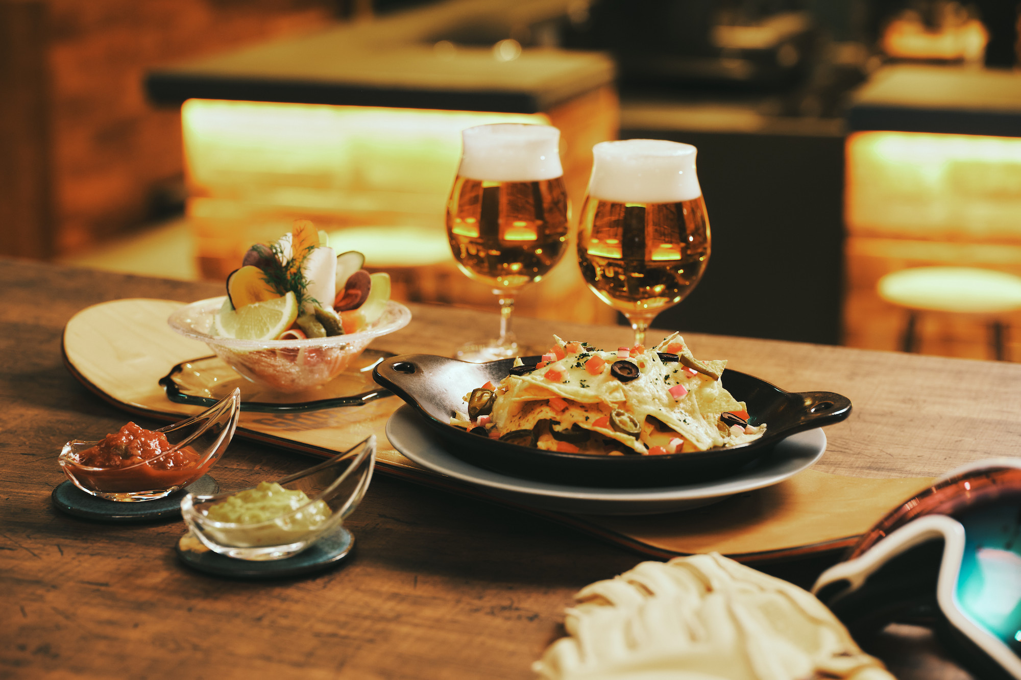 スノーボーダーたちが山から帰ったあとに気軽に立ち寄れる『マウンテンシティパブ』では、スノーボードに見立てたプレートにのったワクワクするフードメニューも販売されている。旭川グルメに詳しいご近所ガイド『OMOレンジャー』が常駐しているので、ふらっと立ち寄って付近のおすすめ飲食店などを尋ね、出かけることもできる。