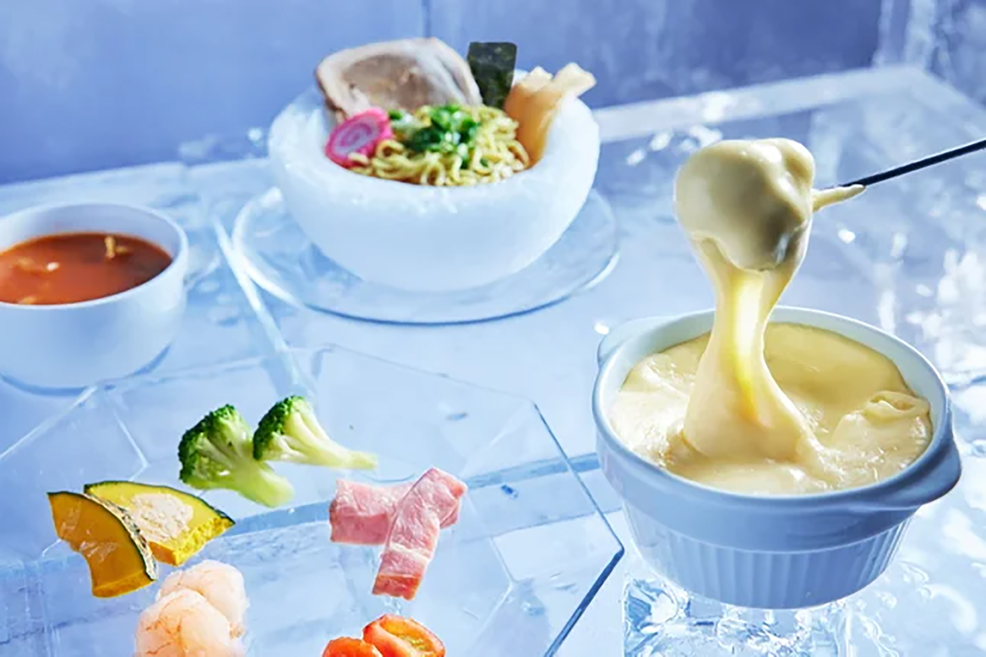 ゲレンデでがっつり滑ったあとに立ち寄りたいのが『氷のレストラン』。ここでは北海道ならではの昆布出汁を使った冷たいスープに、凍ったトッピングを合わせた『氷のラーメン』や、体を温める熱々の『ミネストローネ』などが楽しめる。さらに『チーズフォンデュ』には、エリア内で飼育した牛から搾ったトマム牛乳を使用。とろけるチーズに凍った具材を絡めることで、徐々に溶けて生まれる独特の食感と味の変化を楽しめる。