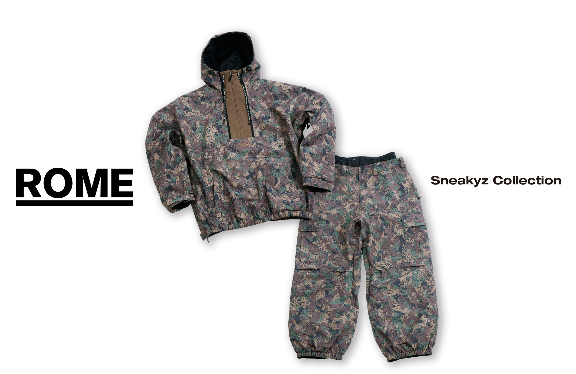 SNEAKYZ CAMOは、ROME OUTERWEARの中でもストリート感と機能性を両立するモデル群に採用されている。Means Jacket、OG Halfzip Jacket、Drifter Jacketといったトップス系に加え、Baggy Pants、Baggy Cargo Pants、Baggy Cargo Bib Pantsといったボトムラインでも展開される。