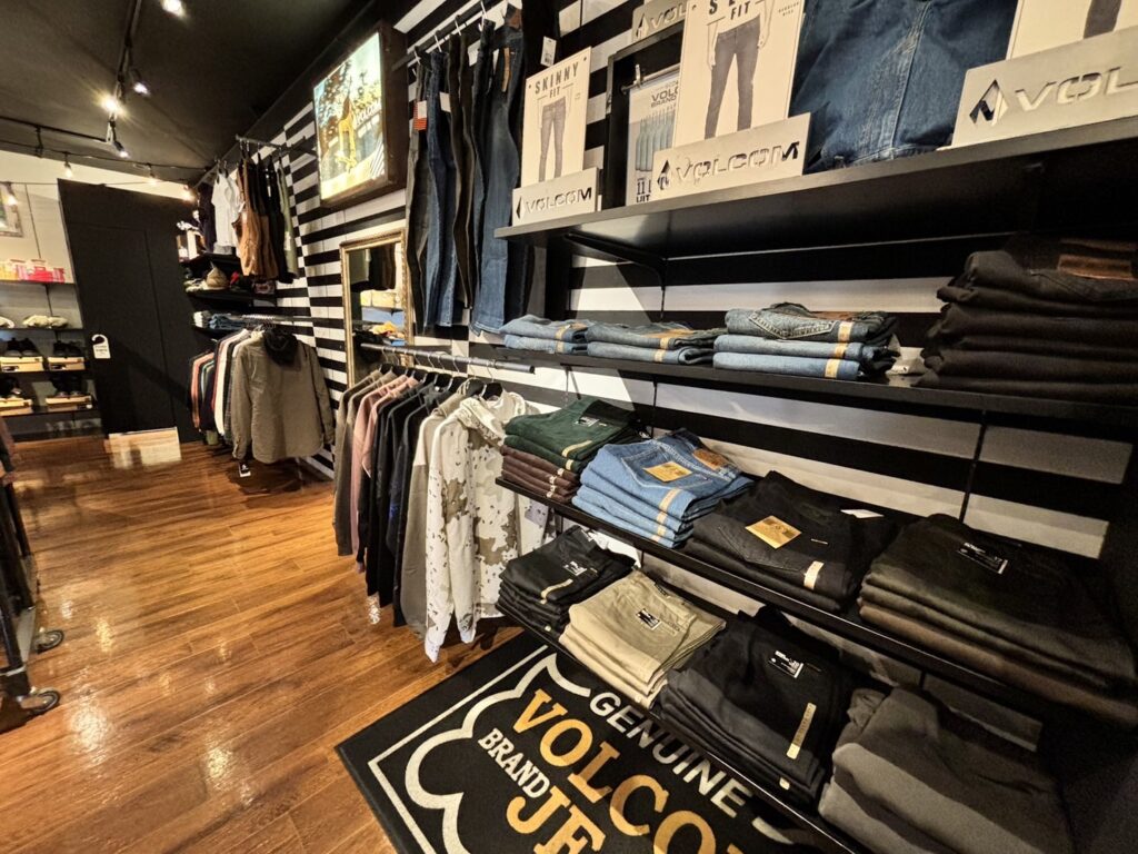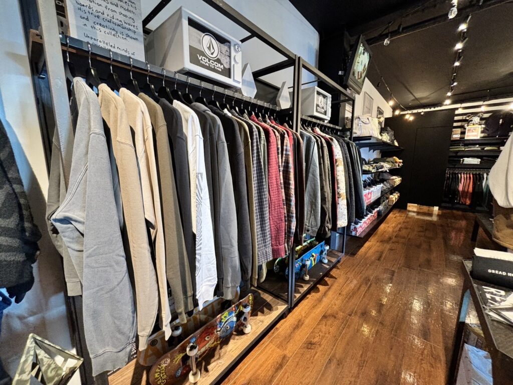 店内には彼女をサポートするVOLCOMアイテムやスケートボード&スケートアパレルがずらりと並ぶ