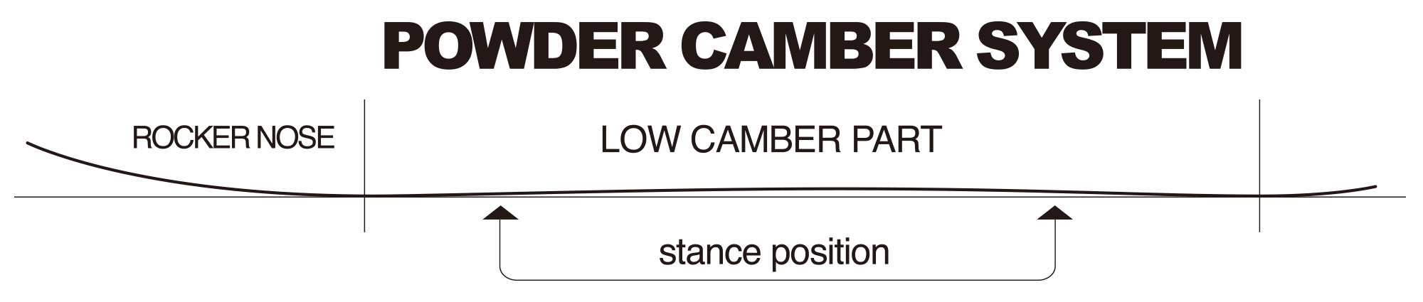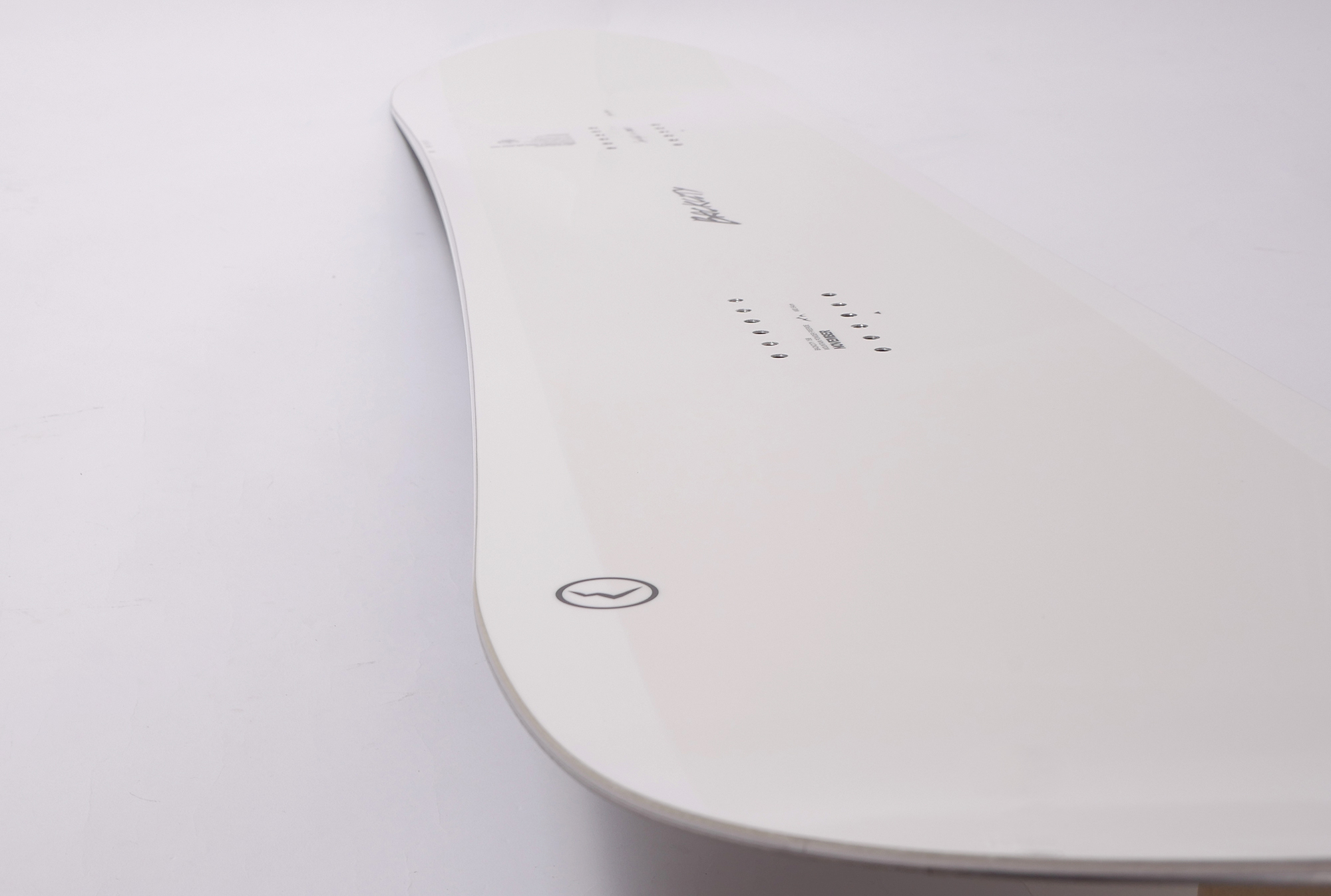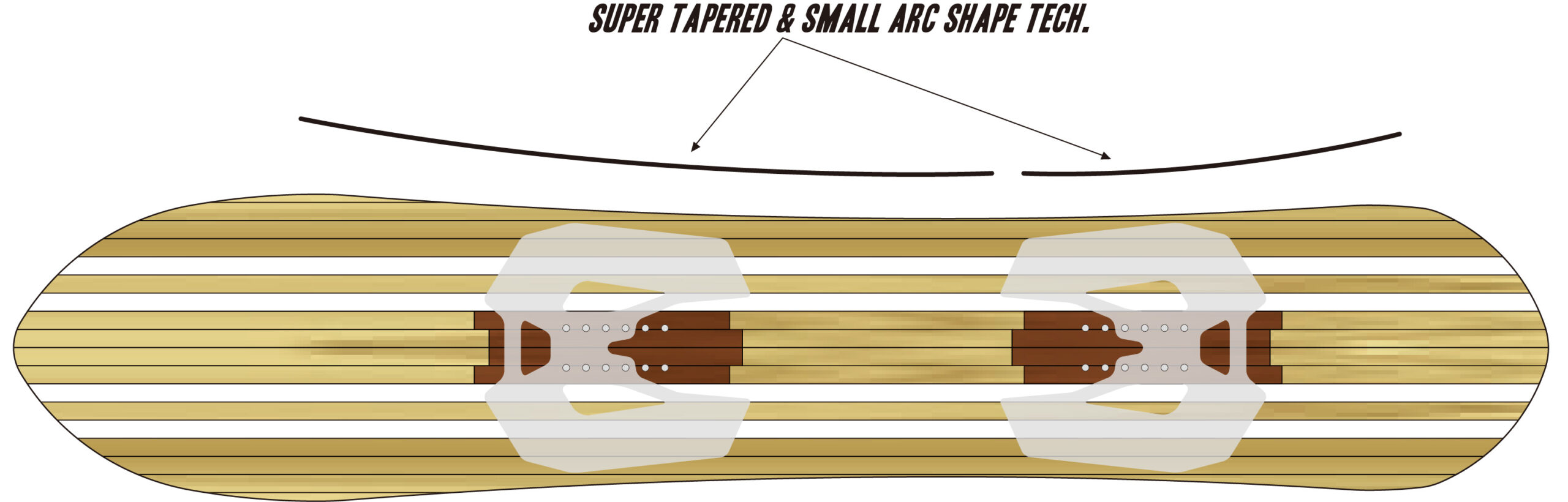 テール側に採用されたSMALL ARC SIDE CUTは、円弧の小さなサイドカーブによってテール部分のコントロール性を高め、ターン後半での安定したエッジグリップを実現している。テーパード形状のボードは圧雪でテールが流れやすい傾向があるが、このサイドカット設計によってテールがしっかり残り、ターン出口での力強い踏み込みが可能になった。圧雪バーンでも安心してスピードに乗れる特性を持ち、パウダーと圧雪の両方で高いターン精度を発揮する。