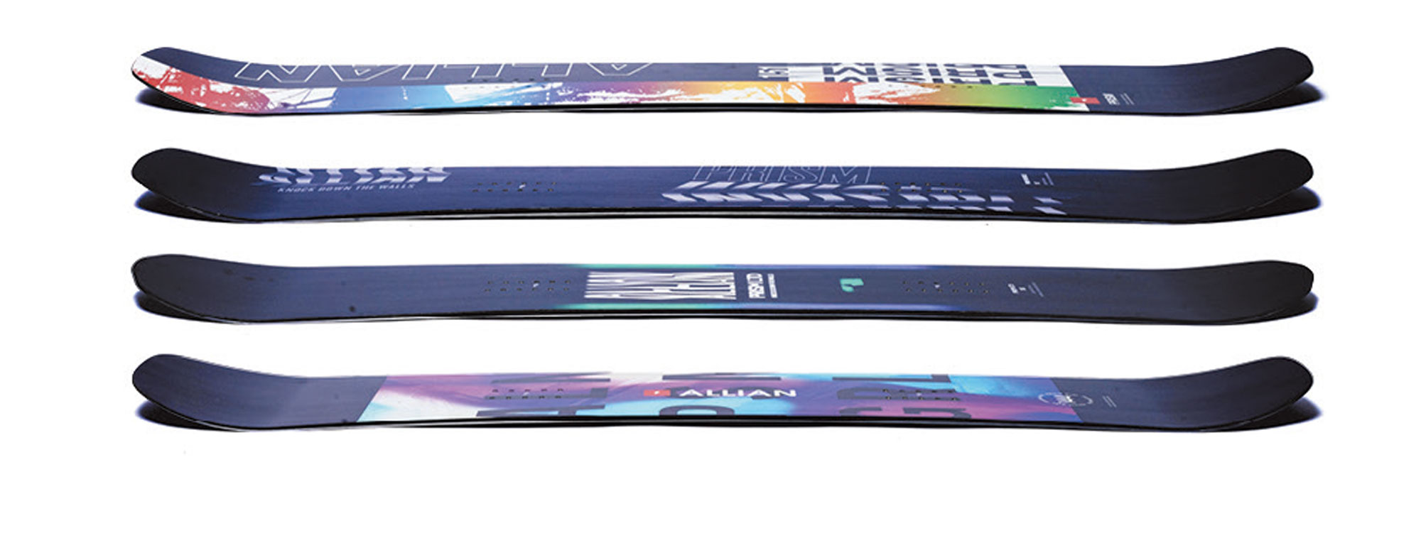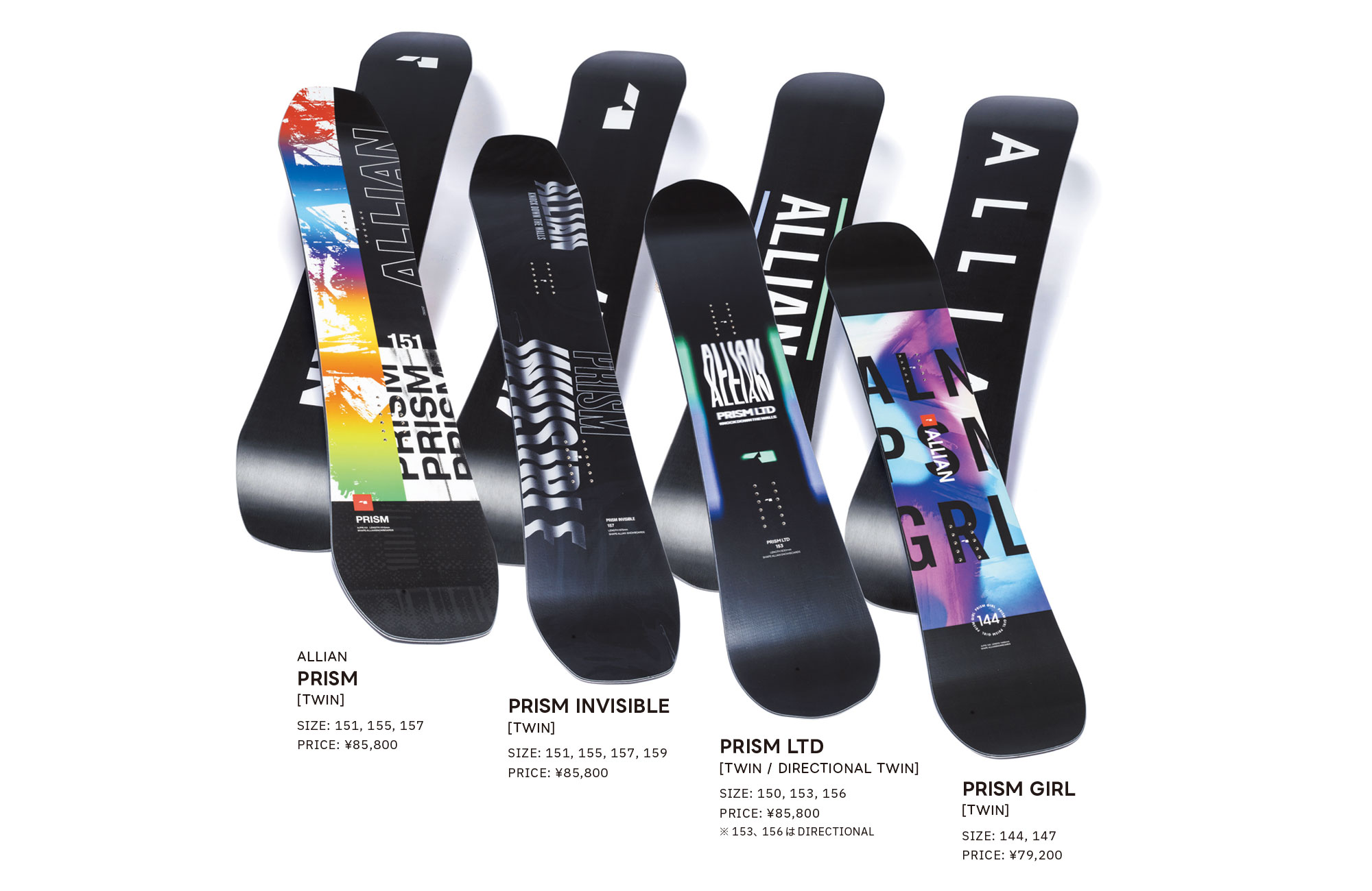 PRISMシリーズはALLIANが長年の経験から導き出したクラシカルなアウトラインとキャンバー形状がベースだ。ブレずに追求してきたからこそ完成した走りの良さとコントロール性が際立つ。上から、PRISM, PRISM INVISIBLE, PRISM LTD、PRISM GIRL