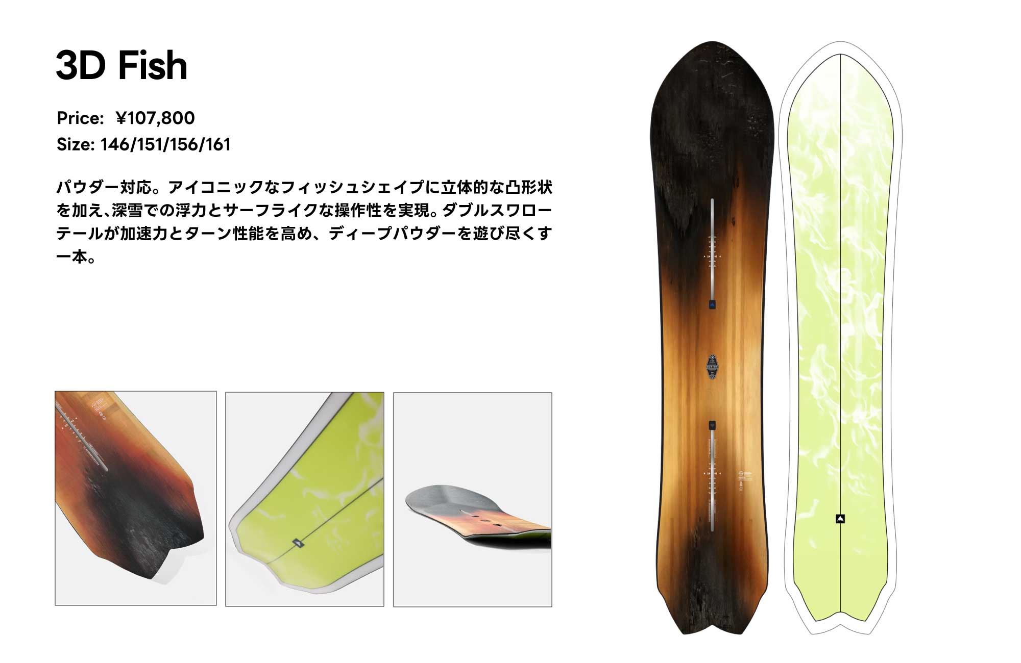 そうした現実的な条件を満たしてくれるのがFish。伝統的なパウダーボードでありながら、最新のFish 3Dはノーズとテールに工夫を加え、深雪では浮力をしっかり確保しつつ、圧雪や春雪でも扱いやすいバランス設計となっている。「春のざらめ雪や荒れたコンディションでも、Fishなら違った楽しみ方ができる」と小鹿さんのお勧めはFish 3D。