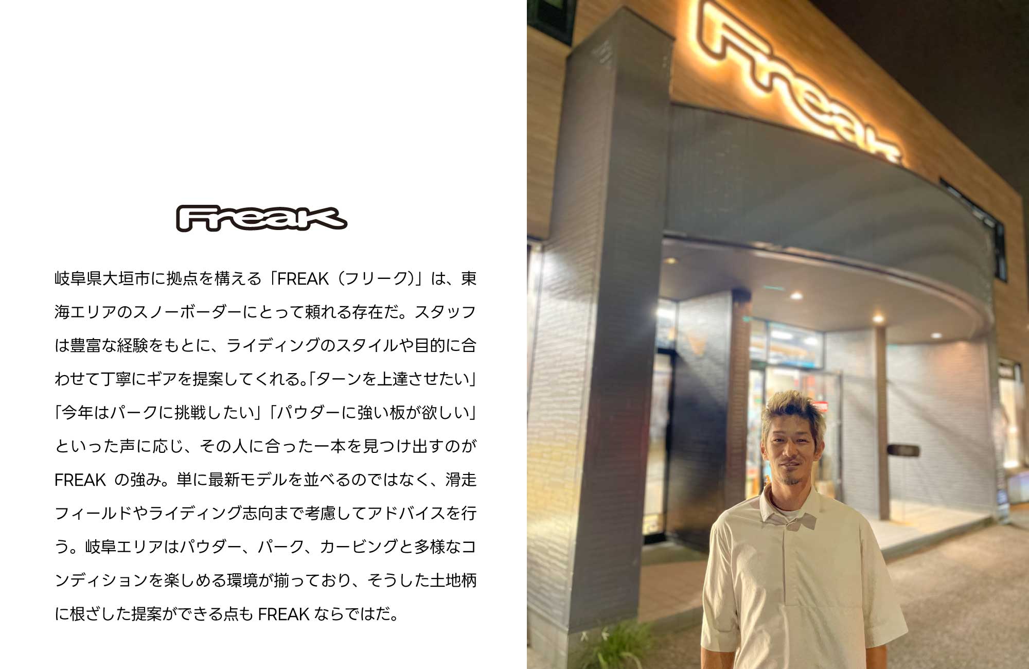 そこで今回は、異なるエリアで豊富なユーザーを見てきたプロショップの声を取材しました。岐阜「FREAK」店長・小鹿さんと、北海道「FREE」店長・佐藤さん。Burtonスノーボードの魅力を熟知している両者のアドバイスを比べることで、自分の滑りたいフィールドや上達の方向性に合った“最短の1本”が見えてきます。