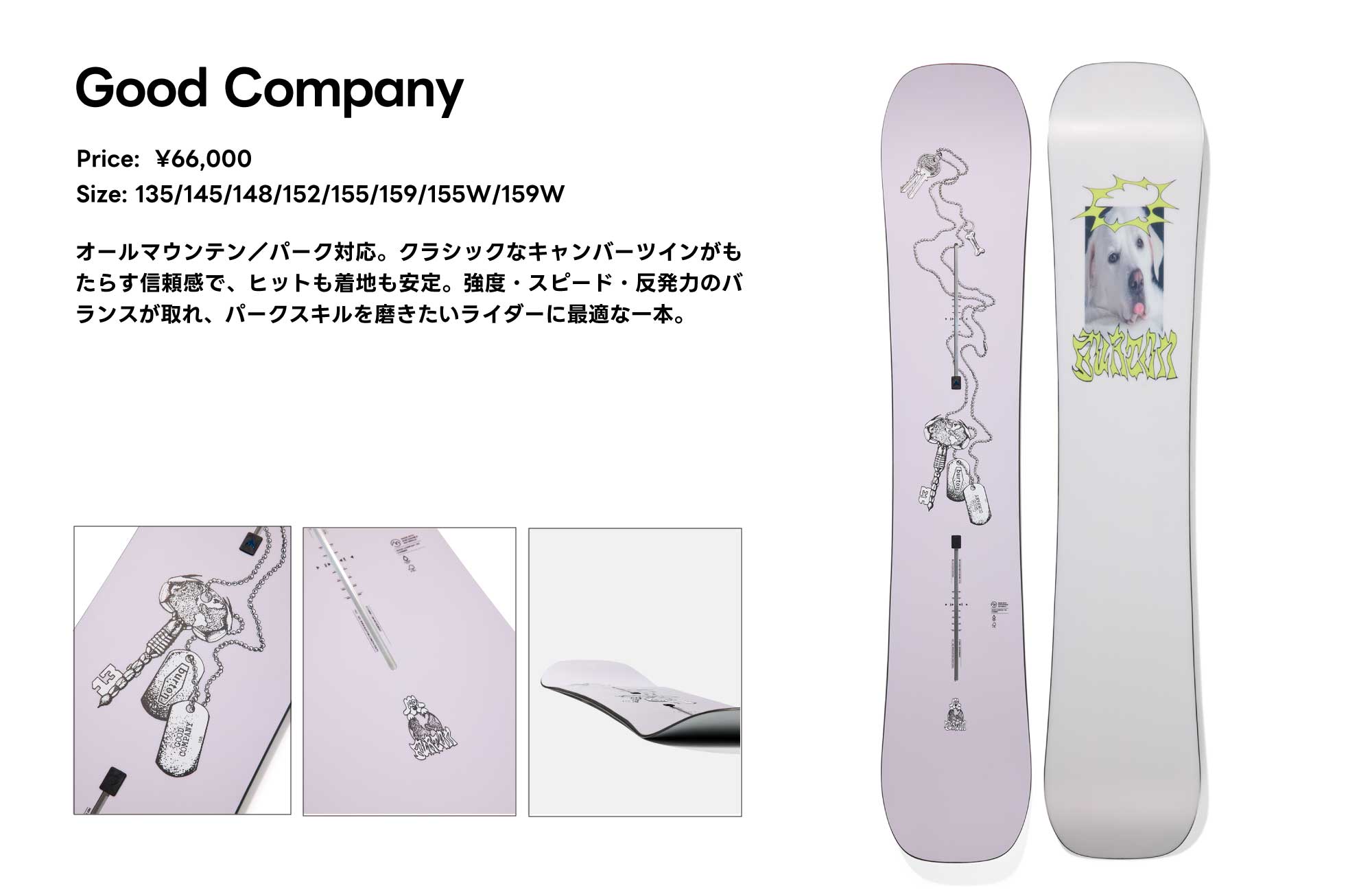 「パークで滑るならフルツインシェイプが理想。Good Companyは数少ないツインチップの選択肢で、キャンバー構造だから扱いやすい。脚力が強くなくても扱いやすいし、バターやプレスといった動きもしやすい」