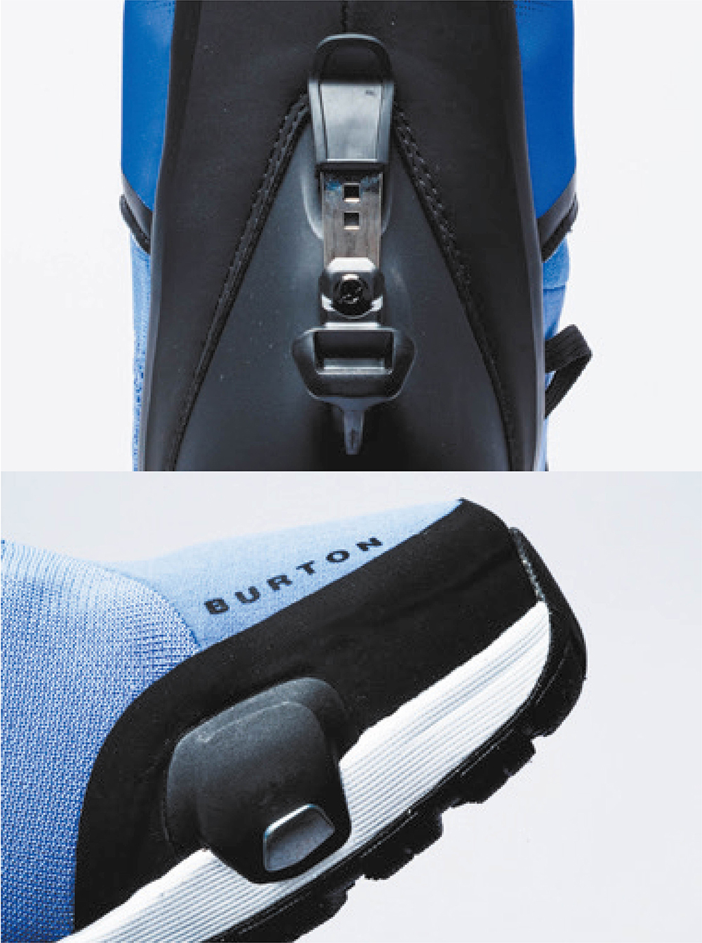 踏み込むだけでツマ先が瞬時に固定され、外すときもスムースさを損なわない構造のトウコネクション。ブーツのツマ先の両サイドにあるクリートが、バインディングのトウフックにロックされることで、滑走中はしっかり固定され続ける。2022年にトウフックが改良され、操作性や快適性がさらに向上した。