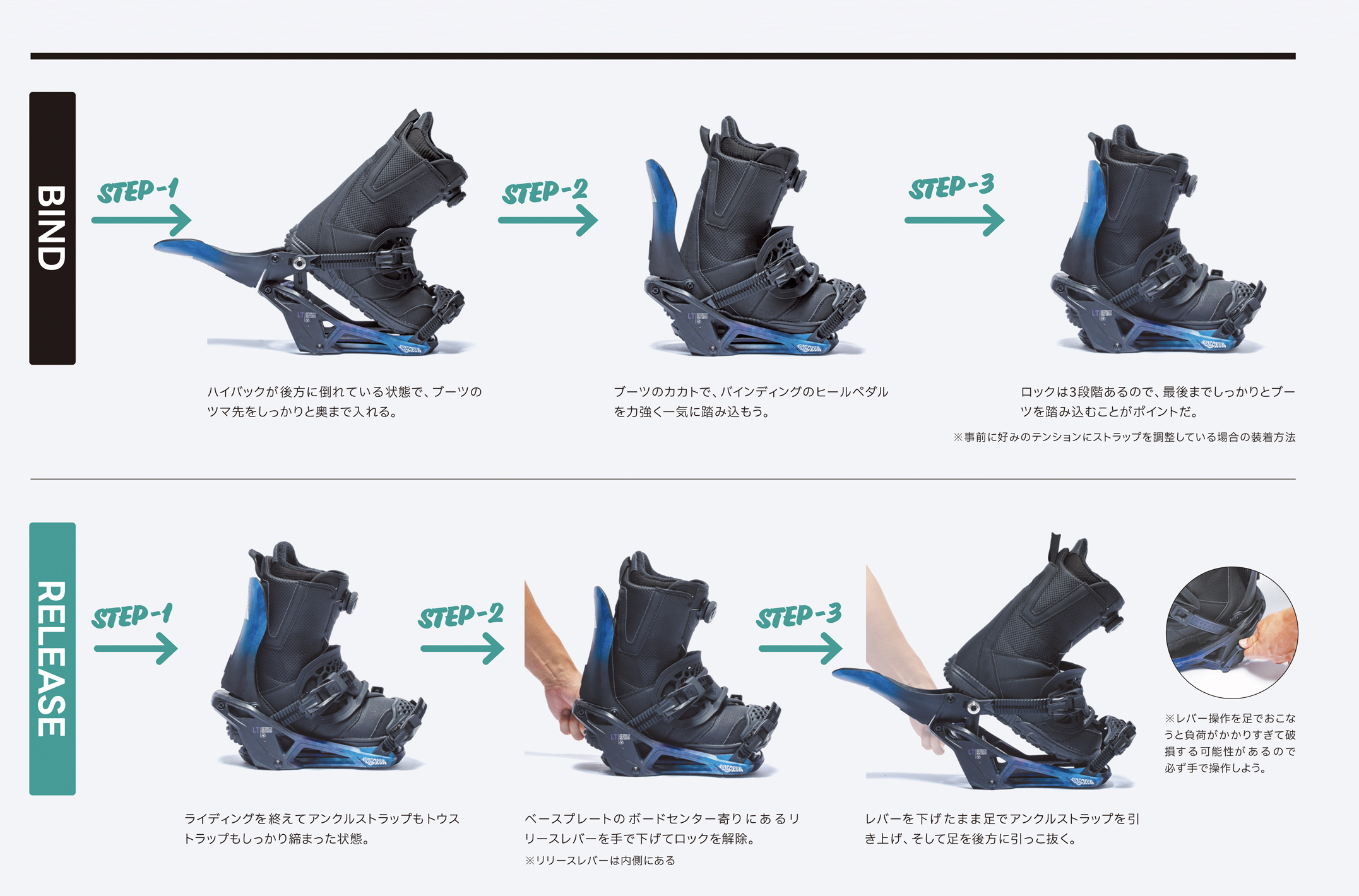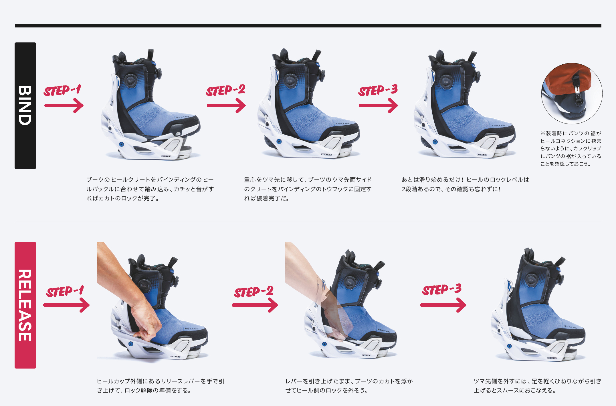 ブーツのカカト部分を踏み込むことでペダルが下がり、それに連動してハイバックが自動的に起き上がって足が固定されるDROP-INシステムが最大の特徴で、事前にユーザーが好みのフィットにラチェットを調整しておけば、再び調整することなく一瞬でバインディングの装着は完了する。