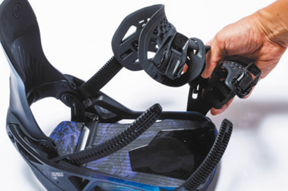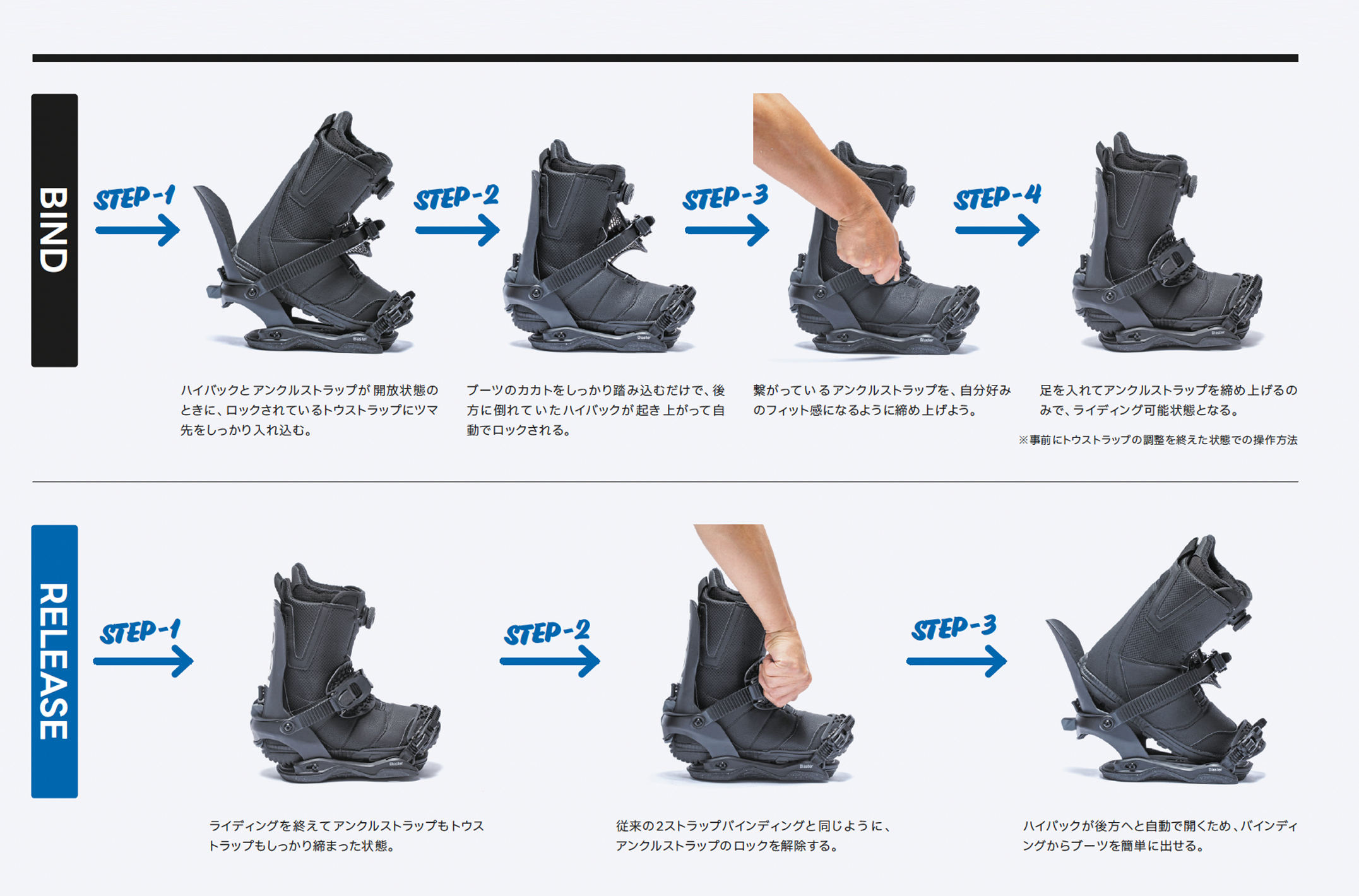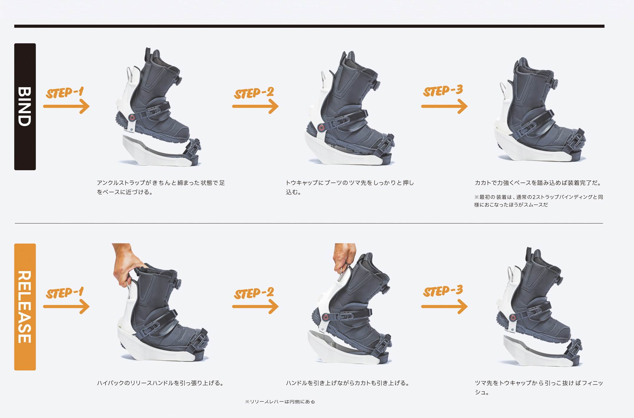 トウストラップを外すことなく、そしてアンクルストラップを完全開放せずともブーツの出し入れが可能で、その動作を実現するために、ハイバックが自動で軽く後方に倒れる構造になっている。もちろん、専用ブーツは必要ない。トウストラップは好みのフィット感に一度合わせれば再調整の必要がなく、アンクルストラップも繋がったままで足入れができるため、装着時は片手で簡単にブーツを固定できる。
