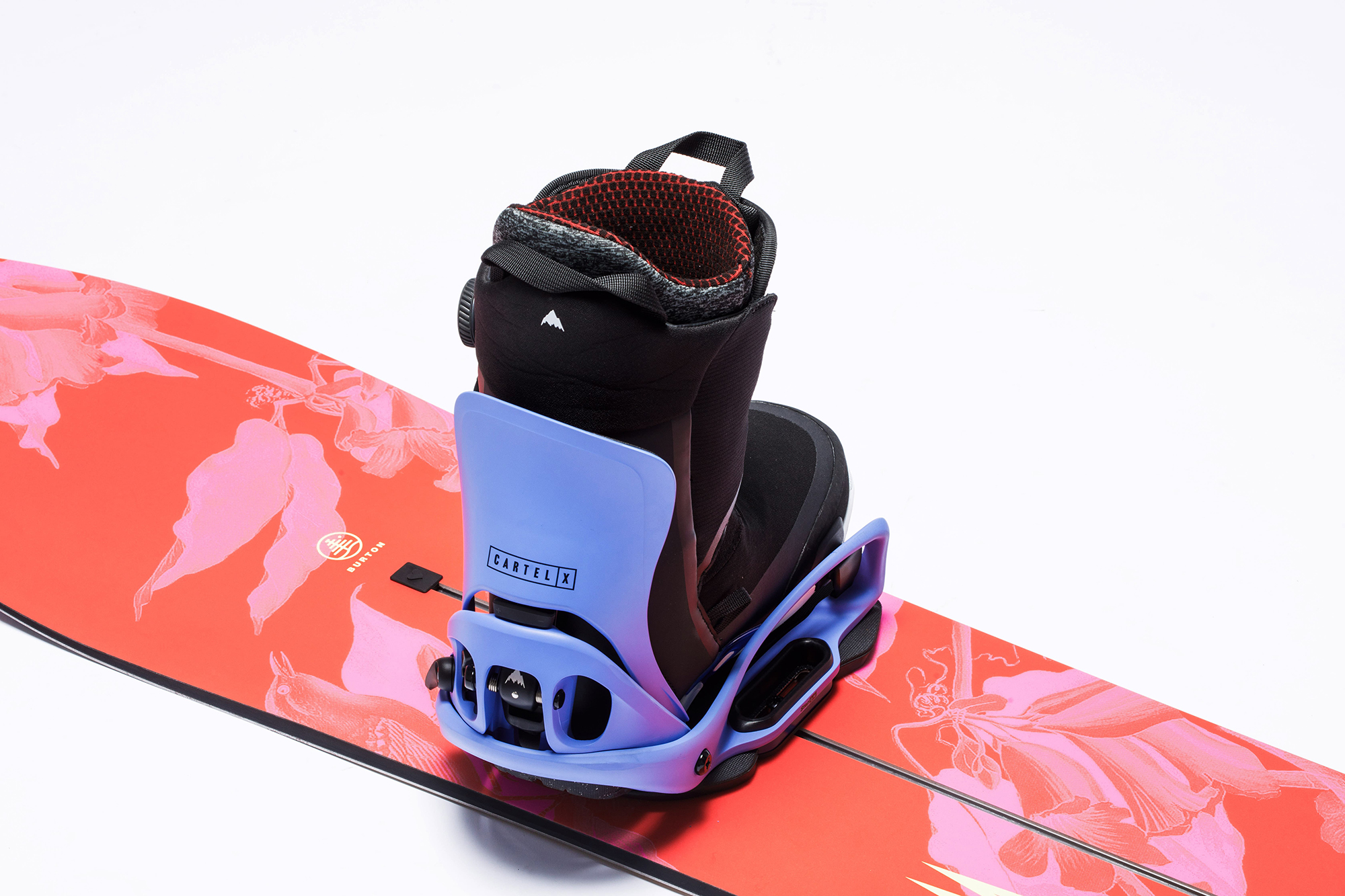STEP ONの特長は、言わずと知れたストラップレスのクイックエントリー構造。だが、単なる着脱の早さだけでなく、BURTON独自のESTシステムを組み合わせることで、その価値は飛躍的に高まるのだ。「Cartel X SO EST」は、ディスクベースを持たない構造により、ブーツから伝わる入力がダイレクトにボードへ届くのが最大の強みだ。雪面の微細なフィードバックをそのまま足裏へ伝え、ボード本来のフレックス性能を最大限に引き出してくれる。まさに、思考と動きがリンクするような一体感を味わえるのがEST最大の魅力だ。