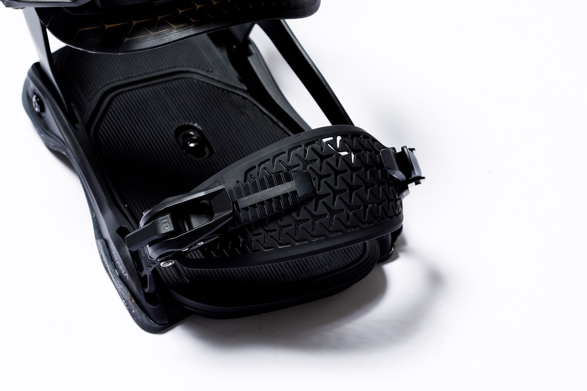 そしてKATANA AW FASEを語る上で外せないのが、どんなブーツにも驚くほどピタッとフィットするAuxTech を搭載したPROGRIPトウストラップだ。AuxTechとは、引っ張ると垂直方向に厚くなる幾何学的構造で、小さなヒンジの集合体がブーツ形状に合わせて自在に変形し、圧力を均等に分散。その結果、足先のホールド性と快適性が両立し、長時間滑ってもストレスがかかりにくい。つま先をしっかりホールドできるこの安心感は、どんな雪質・地形でも思い切った動きに集中させてくれる大きなポイントだ。