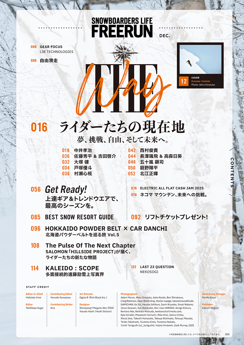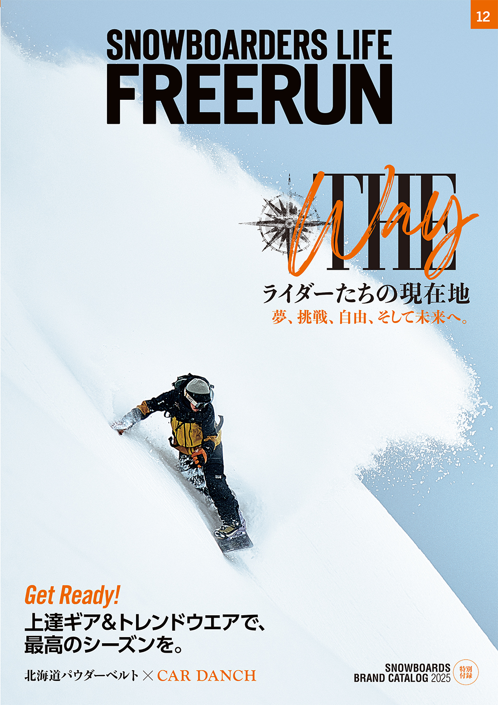 今月号の特集は、ライダーたちの現在地を探る、『THE Way』。 FREERUNが注目する12人のスノーボーターたちにとってのスノーボードとは何か。今向き合っているスノーボードライフ。そして、見据える先にどんな未来を見ているのか。日本のスノーボードシーンを創る彼らの想いを探りました。