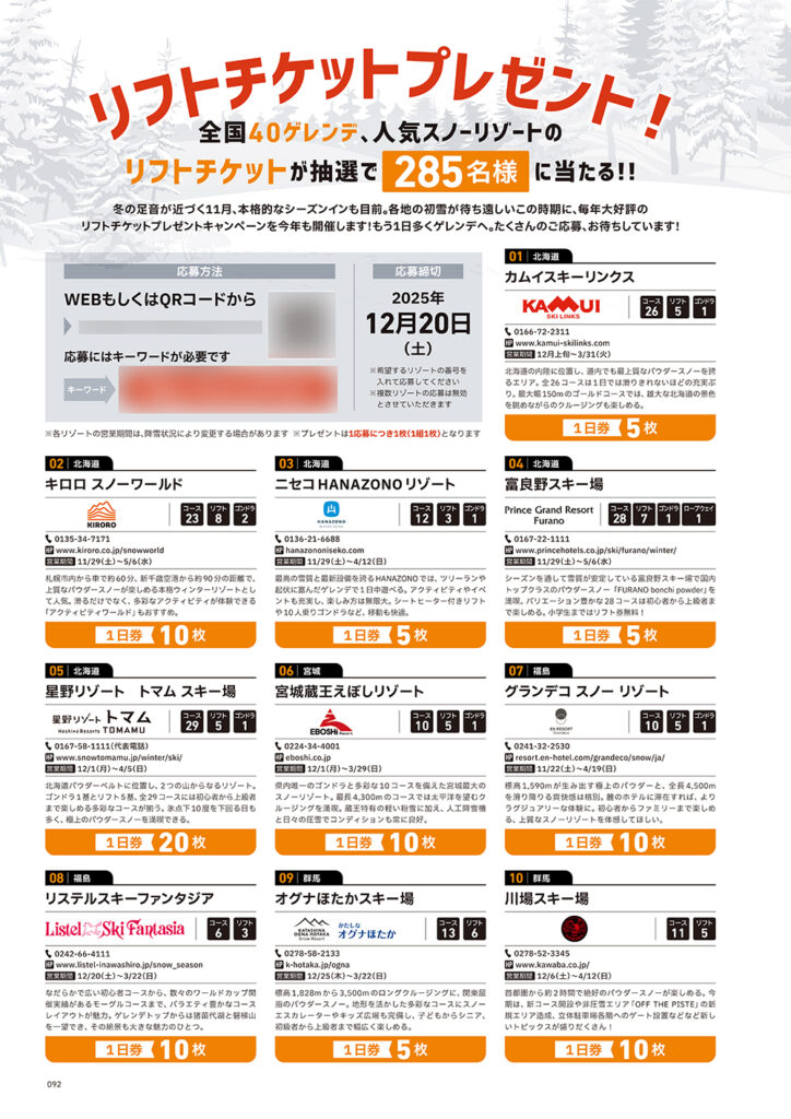 全国40ヶ所、人気のスノーリゾートのリフト券が抽選で当たります!
