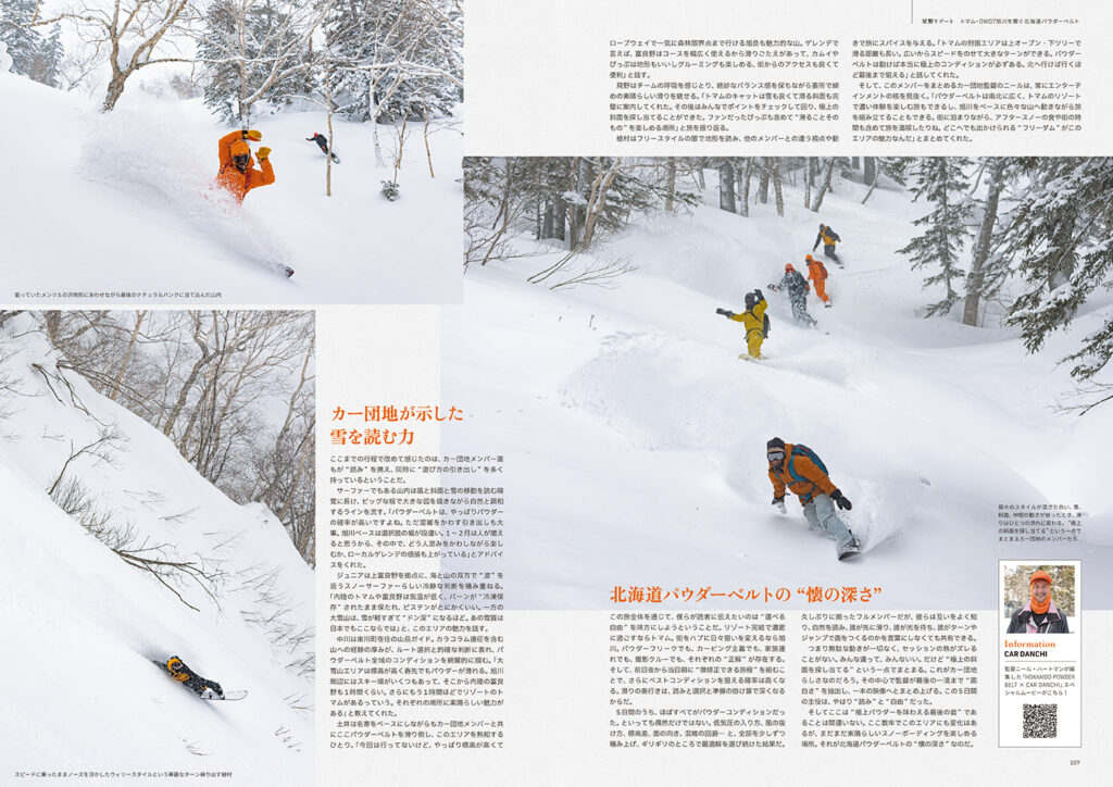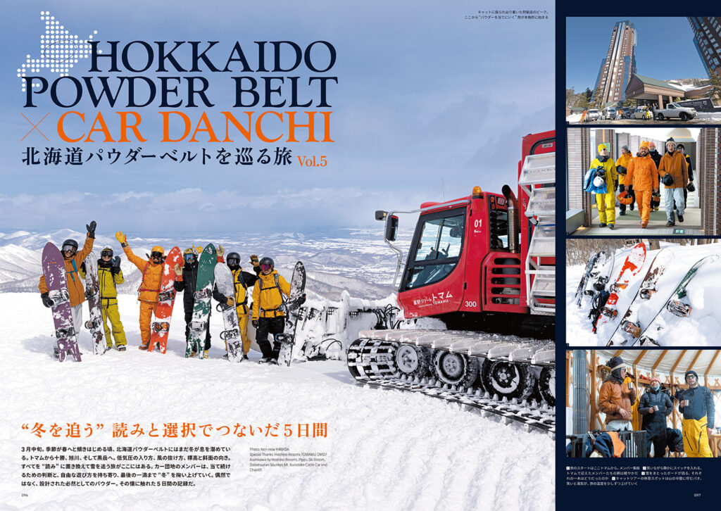 北海道の中央に南北約200キロに渡り広がる北海道パウダーベルト。春へと季節が移り変わる3月中旬にもかかわらず、見事な「雪を読む力」を発揮し、5日間を繋いだカー団地クルーとの旅の様子をお届けします。