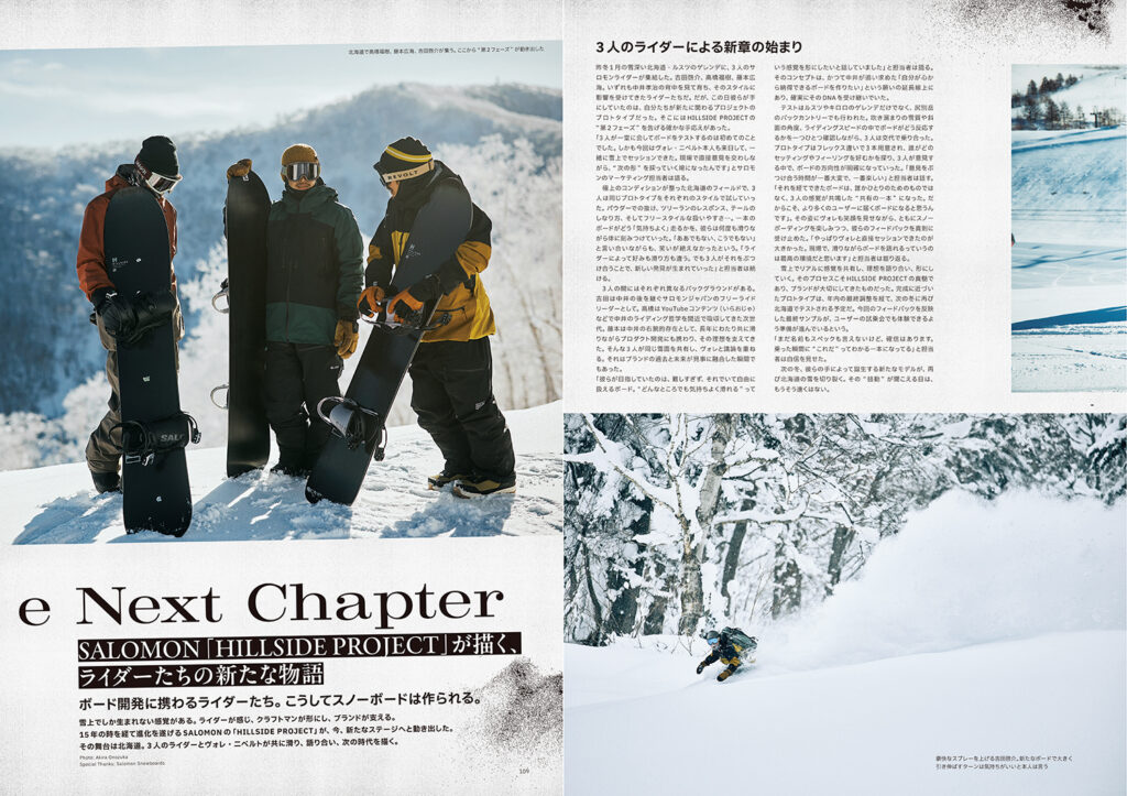 吉田啓介、高橋福樹、藤本広海とサロモンのデザインディレクター兼クラフトマンでもあるヴォレ・ニベルトが共に滑り、語り合い、次の時代を描いていく。15年の時を経て今、新たなステージへと動き出した「HILLSIDE PROJECT」の先にあるものは。