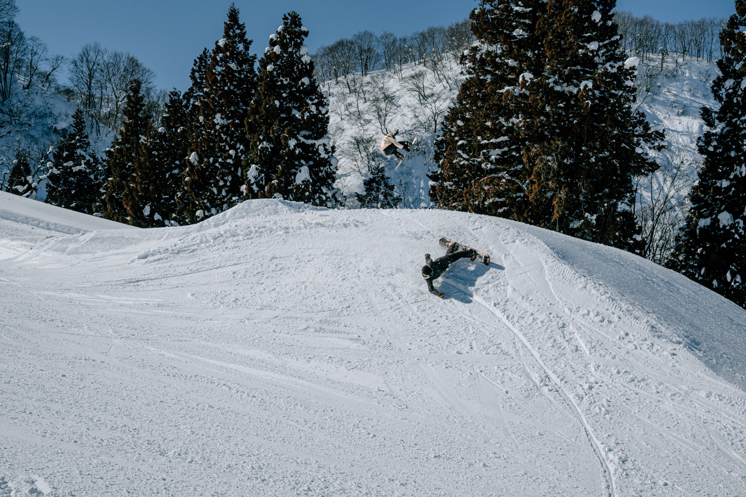 また、面白そうなヒットポイントがあっても、そこに適したスピードでエントリーできないとイメージどおりの遊びはしづらいもの。だが、石打はそういったポイントにスピードをつけて入れる斜面が、その直前にあるから不思議だ。そんな当てどころが必ず用意されているのも、石打の地形の面白さだろう。入るライン、スピードによって、遊び方が無限に広がる。だから、幾度となく滑っても飽きないのだ。
