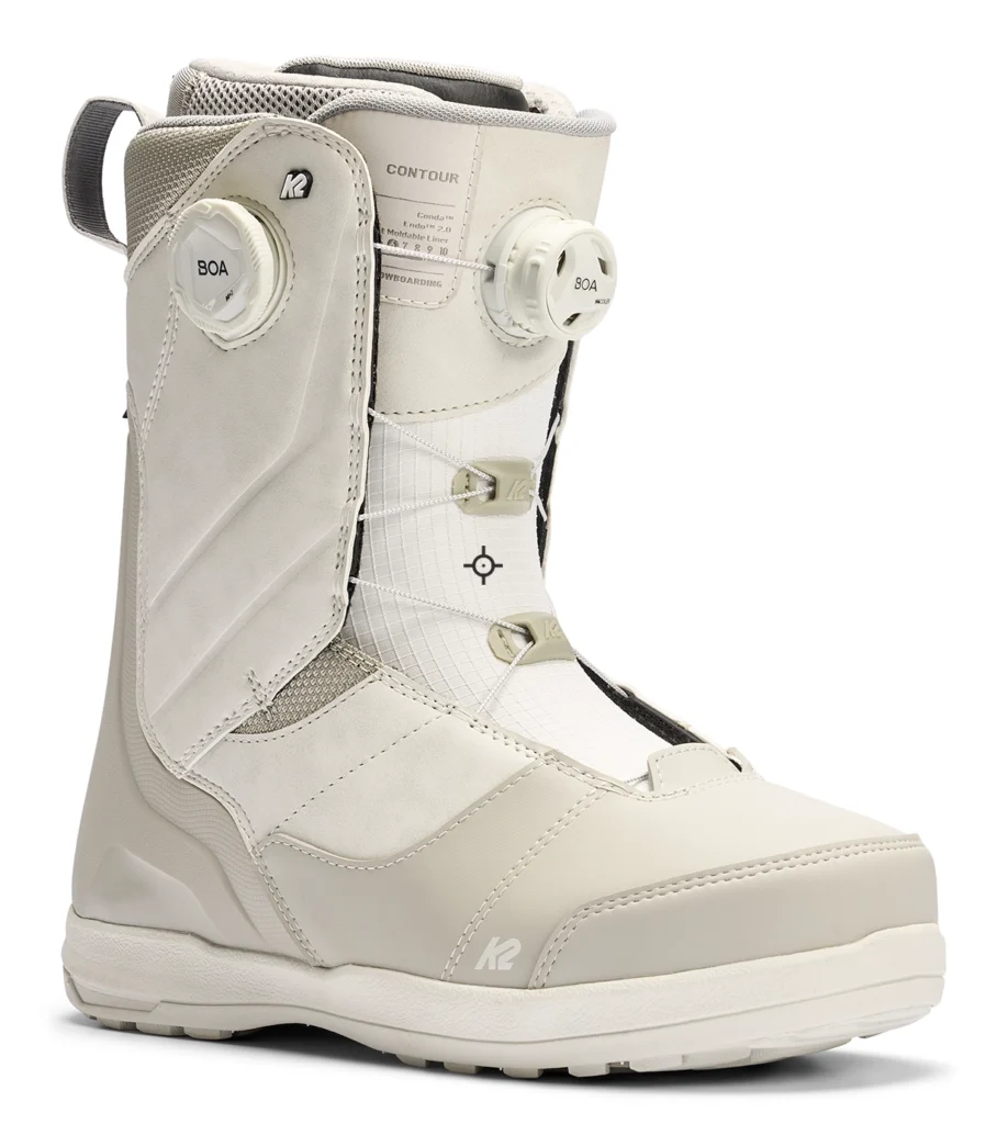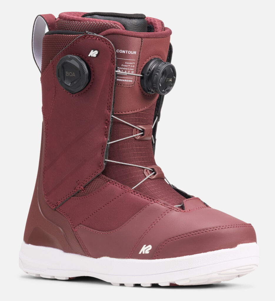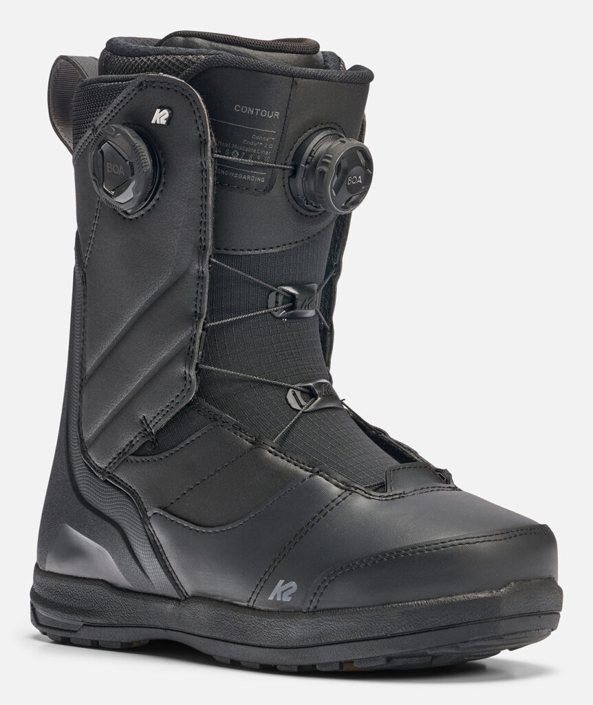 ブーツのCONTOURはミッドハードフレックスで、Intuition® Control-Foam-3DライナーとBoa® Conda™システムにより足首からかかとまでしっかりとホールド。未整備の斜面やナチュラルジャンプでの滑走時もブレを最小限に抑え、技術に集中できる環境を提供している。