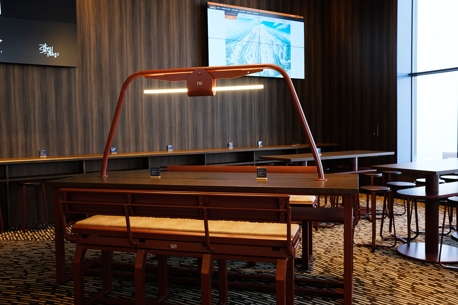 日本最古のクワッドリフト「センターフォー」のリフトの椅子(搬器)を、レストラン内部の家具として再利用
