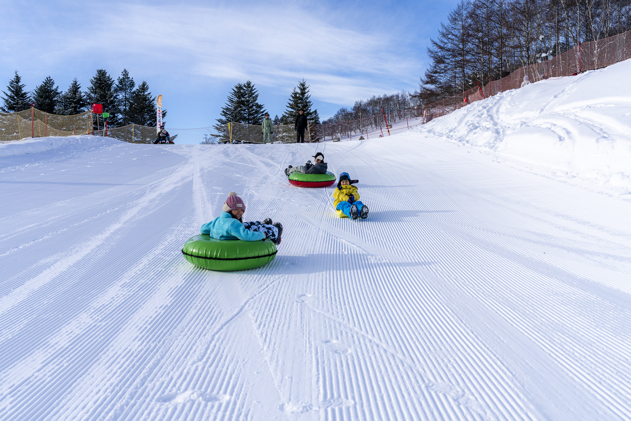 もうひとつは、ゴムボートに乗って雪原を滑走する「スノーラフティング」。夏の海のバナナボートの雪原版と言えばイメージしやすいだろうか。こちらも初トライだったが、想像以上のスピード感と、パウダーに突っ込んでスプレーを浴びる新感覚の爽快さに、思わず「ウォー!」と声が出るほど楽しめた(体験時間10~15分/大人2,800円・こども2,200円~・要事前予約)。