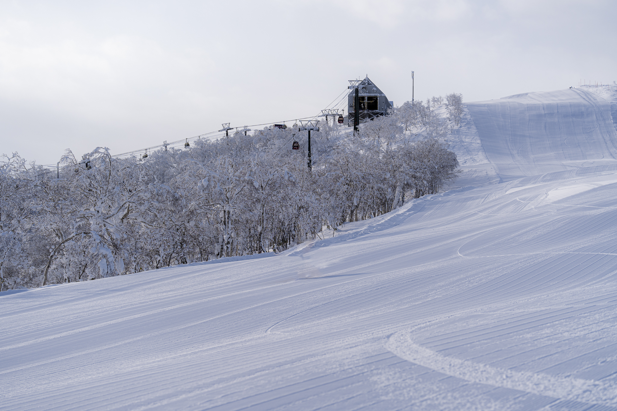そして、もうひとつの象徴的な存在が「継ぎ目がない」と称されるグルーミングバーン。熟練の圧雪チームが夜通し整備したバーンは、エッジのかかり方、雪面の均一さともに別格で、「パウダー以上に楽しい」と評されることもあるほど完成度が高い。