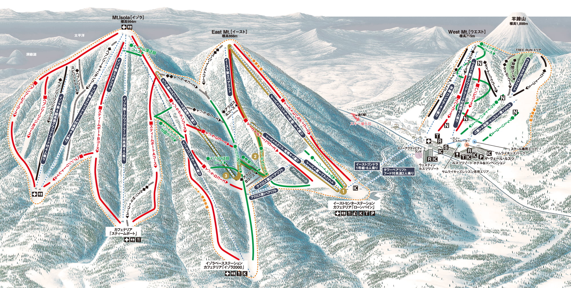 ゲレンデは「イーストMt.」「Mt. イゾラ」「ウエストMt.」の3つの山で構成され、総滑走距離は42km、コース数は37。コース幅が広く、ロングに滑れるラインが随所に用意されているのもルスツならではだ。マップ上ではその広さに圧倒されるが、複数あるゴンドラとリフトを活用すれば、効率よく目当てのコースを巡ることができる。