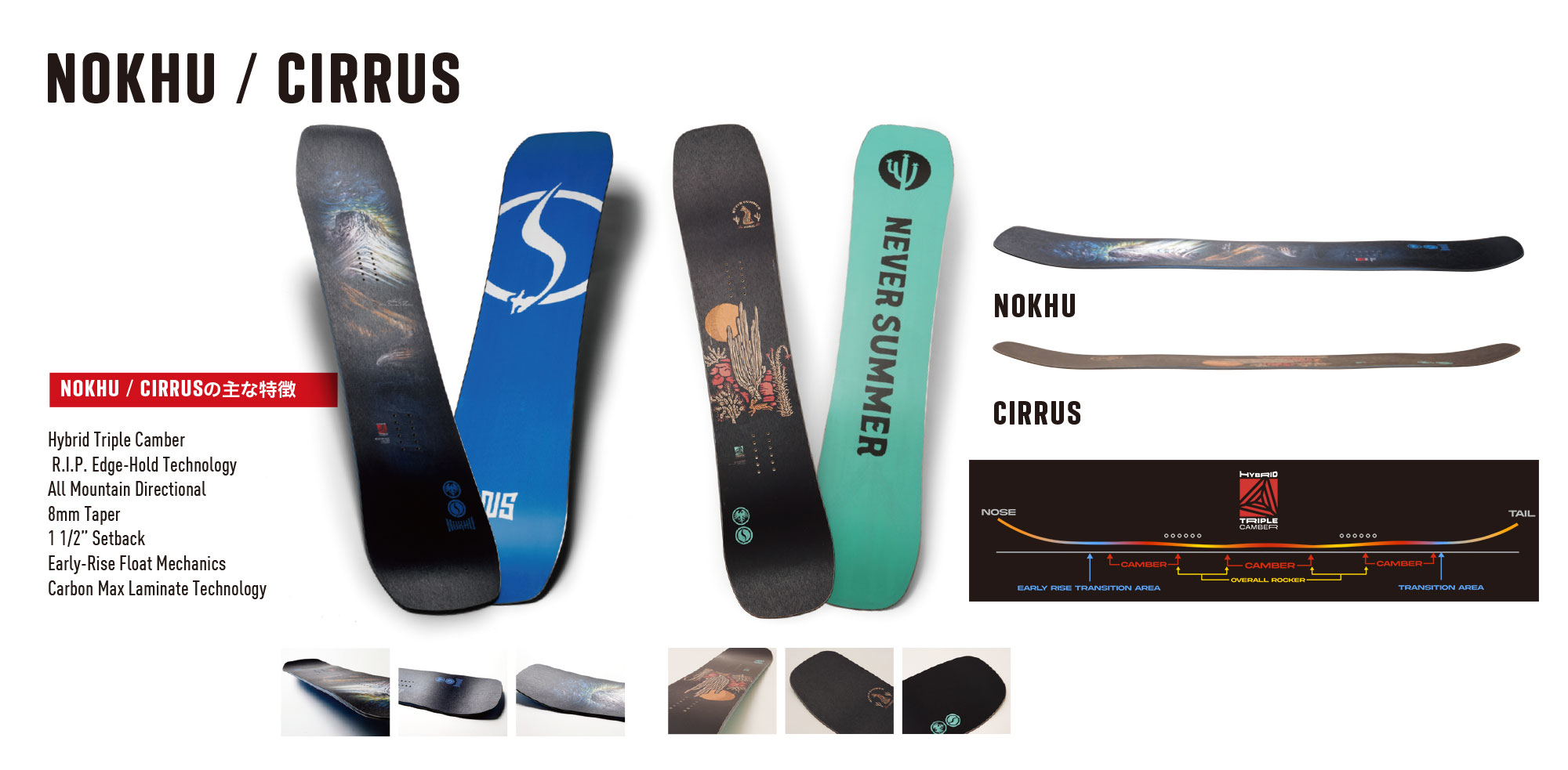 さらに、このNOKHU の設計思想を女性ライダー向けに最適化したのが「CIRRUS(シーラス)」である。単なるサイズダウンではなく、NEVER SUMMER が掲げる「こけない」「疲れない」「裏切らない」という哲学を女性でも体感できるように、フレックスやシェイプバランスを徹底的に調整。小柄な体格でも取り回しやすく、それでいてパウダーでの浮力や荒れたバーンでの安定感をしっかり備えている。CIRRUSは、これまでサイズや硬さの問題でNEVER SUMMER を諦めていた女性ライダーにとって待望の選択肢。NOKHU とCIRRUS は、男女を問わず「地形すべてを遊び場に変える」というNEVER SUMMER の真価を体現する、双璧のオールラウンドボードだ。