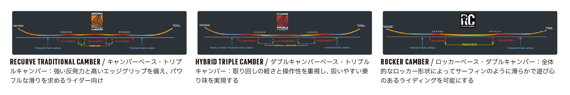 やや広めのウエストとディレクショナルシェイプを備え、フリーライディングに特化した安定性能を追求。リカーブ・トラディショナルキャンバーとR.I.P. エッジホールドテクノロジーにより、アイシーなバーンでも安心感のある操作性を発揮。高速域での安定感、壁や沢でのライン取りに強く、フリーライディングをベースに“ 攻め” を志向するライダーに最適。パウダーでの浮力も十分に備えた次世代のオールマウンテンボード。