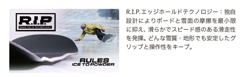 加えて、最新のカーボンテクノロジーが即応性と安定性を高め、R.I.P.エッジホールドテクノロジーがアイシーなバーンでも信頼性あるグリップを提供。不要な引っかかりを防ぎながら鋭く雪面をとらえるその性能は、疲労の軽減と上達スピードの加速につながっている。
