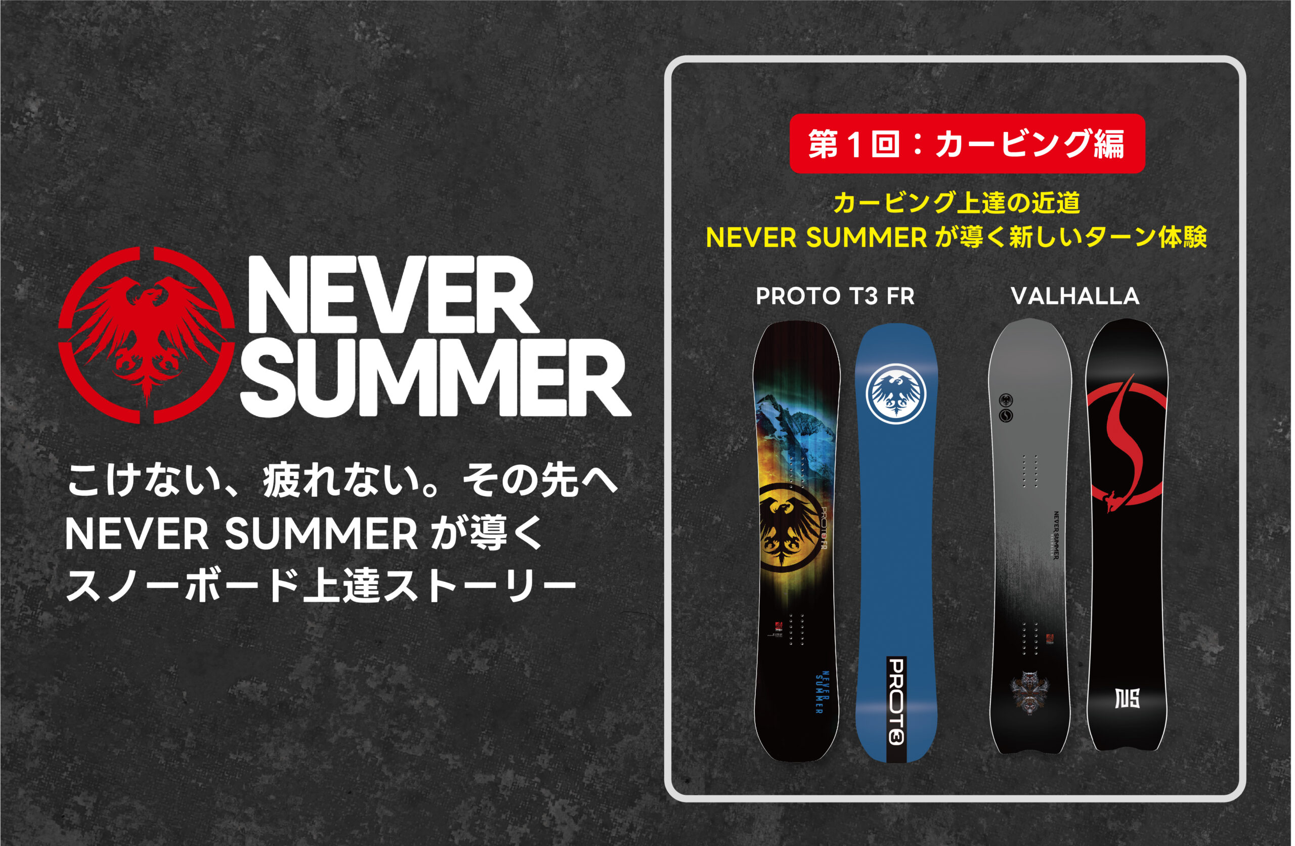 NEVER SUMMERは「こけない」「疲れない」「正しい動きを体感できる」という要素を兼ね備え、ライダーを自然に上達へ導く稀有なブランドだ。カービングを練習するならPROTO FR(T3 FR)が最適な選択肢であり、さらなる高みを目指すならVALHALLAが待っている。