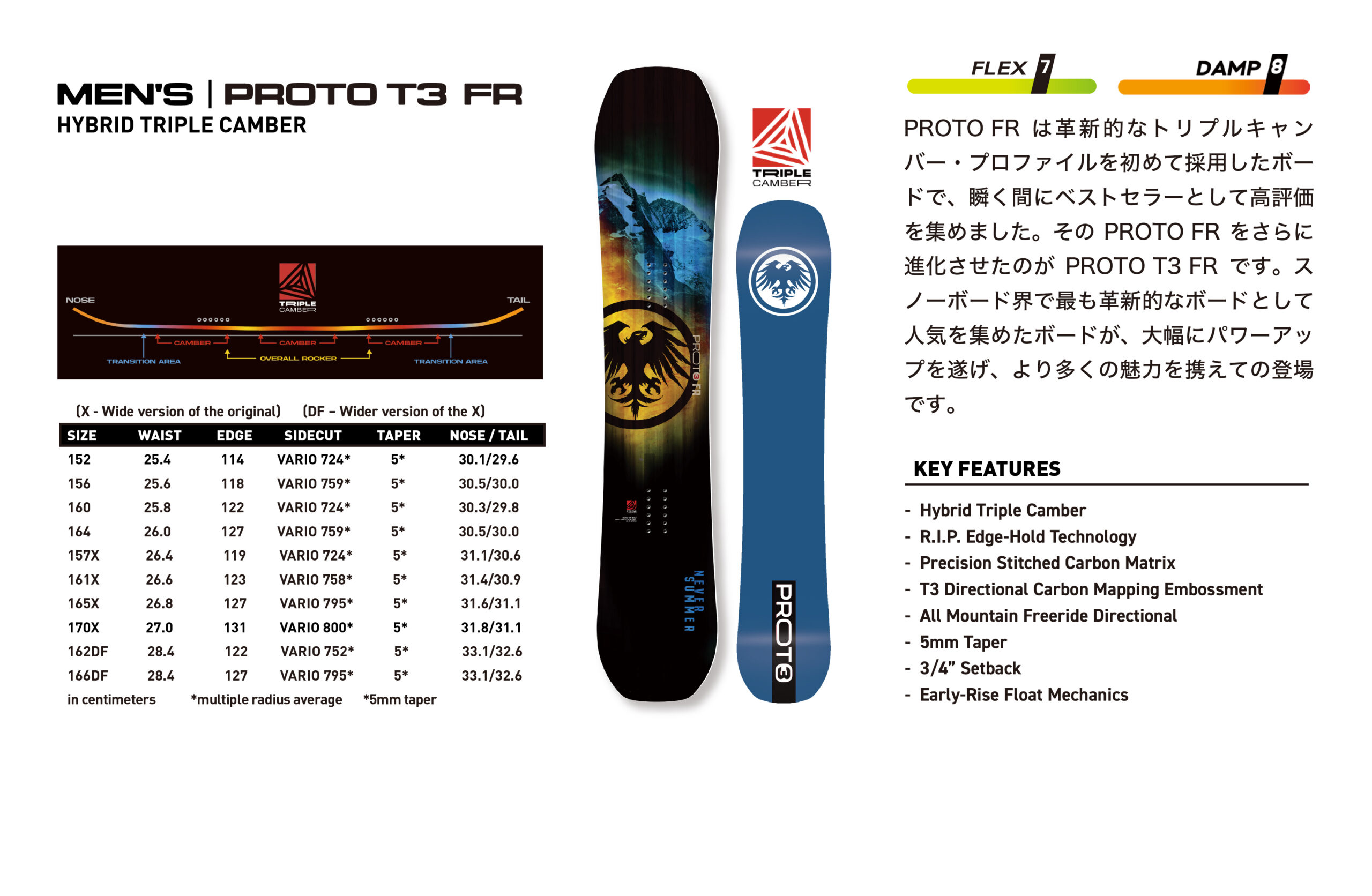 カービング技術を磨きたいライダーにまずお薦めしたいのが「PROTO FR(現行T3 FR)」だ。寺尾店長はこのモデルを「カービング練習マシーン」と表現する。その理由はトリプルキャンバーによる独自の接地感にある。コンタクトポイントが4点に増えることで、雪面に対するグリップが非常に強く、氷の斜面ですら鋸のように切り裂いて進むことができるのだ。