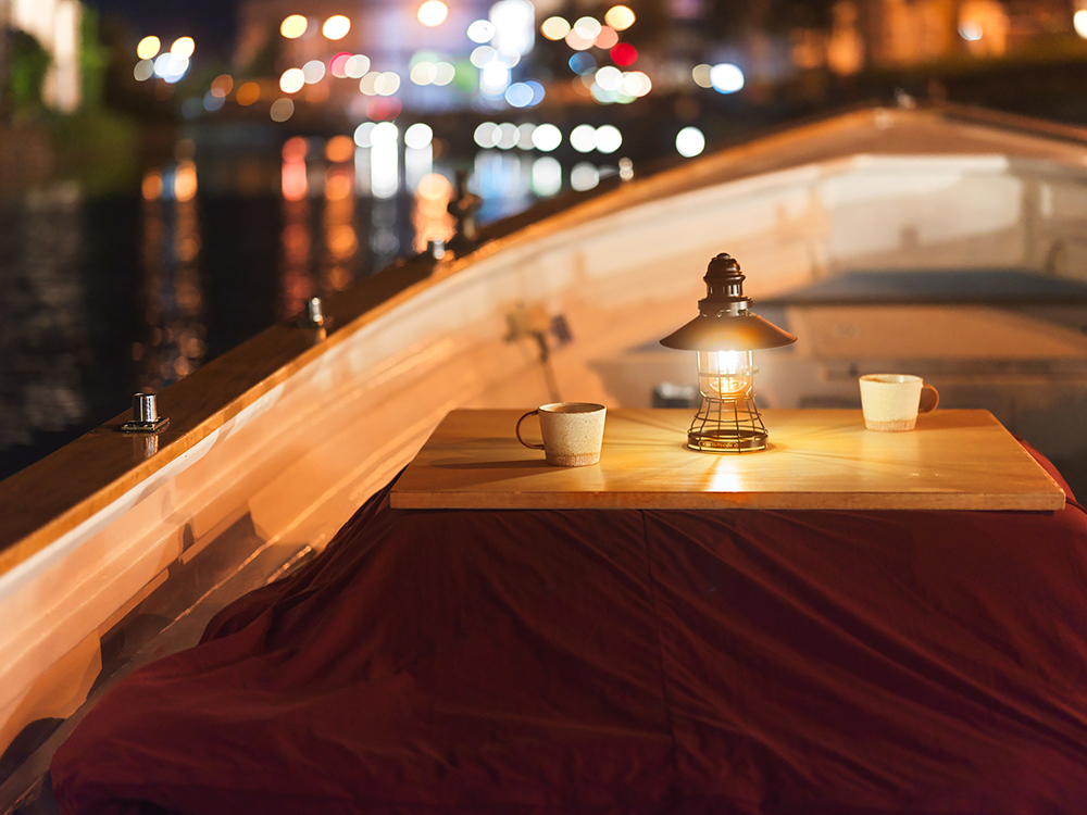 通常ベンチ席で運行している運河クルージングとは異なり、このコンテンツではこたつを設えた専用の船が使われる。寒さ厳しい小樽の冬でも、船上で温かく過ごすことができる。こたつの上にランプの温かい光を灯し、静かに進んでゆくクルージングは約40分。ゆったりした時間のなかで、雪に包まれた歴史的建造物が並ぶ小樽の街並みを、優雅に眺めることができる。