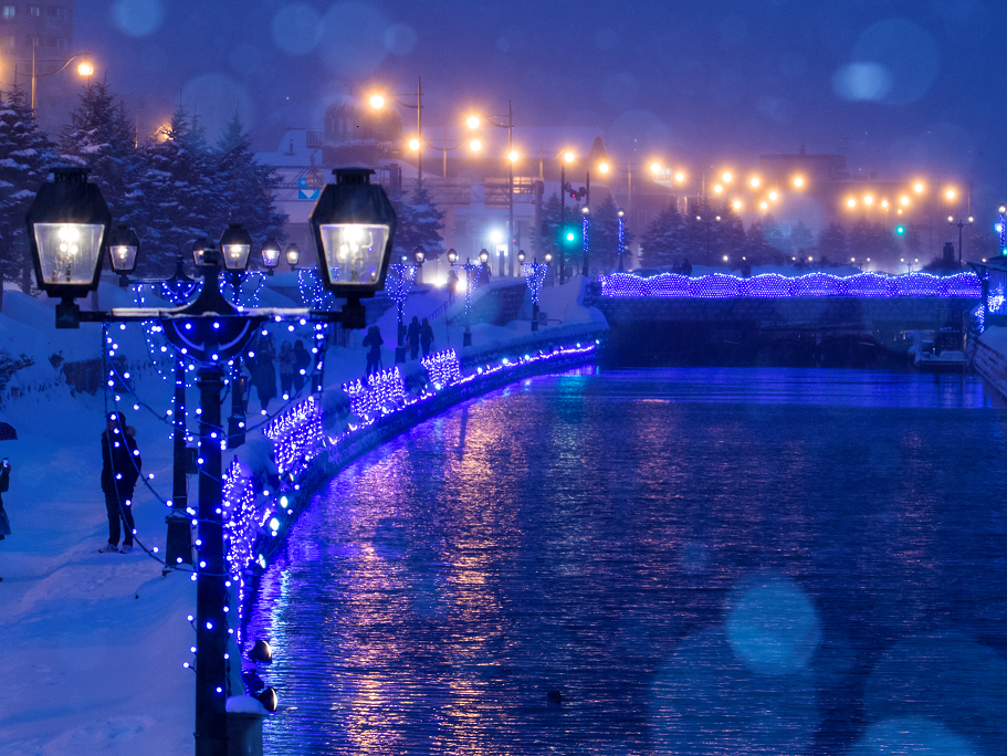 小樽運河には重厚な木骨石造の倉庫群など、歴史的建造物が立ち並び、異国情緒が溢れている。クルーズは日没後、ガス灯が運河を照らす時間帯にスタートするので、雪が積もったレトロな建物とガス灯の温かい灯りのマッチングにより、その時々に様々な幻想美を見ることができる。さらに1月までは、青い光でライトアップされる『青の運河』を、船上の特等席から眺めることもできる。とくに日没後のブルーアワーの時間帯に、空の蒼とイルミネーションの青が織りなす景色は、ロマンチックなことこの上なし。この船に乗らなければ見られない「画像」を記憶に刻み込むことができる。