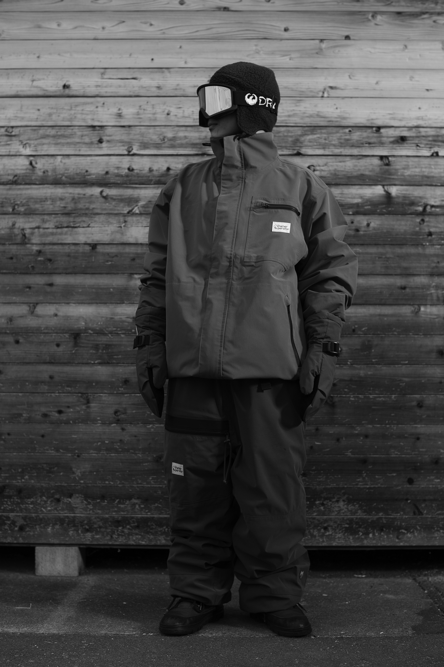 ウェアのラインナップは、日本とアメリカが互いに影響を与え合いながら組み立てており、現状はジャケット2型、パンツ2型、グローブ2型が共通で展開されている。本国ではビブパンツやフルジップのカスタムオーダーも行っており、ユーザーが着丈や身幅、色、パッチ、ドローコード仕様まで選べる仕組みも健在だ。いわば “必要なものだけを丁寧につくる” という姿勢が貫かれていて、毎シーズン無理に新作を作る必要はないという哲学もブレない。創業時から続くその考え方は今も受け継がれている。