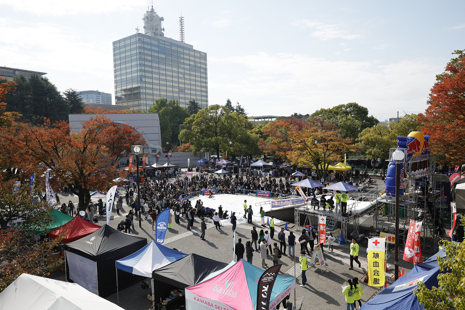 この日雪広場以外の場所でも様々な催しが行われておりメインステージでは、「キリハレバレ」「ORCALAND」「TOTALFAT」といったアーティストの皆さんがライブ演奏を行い、雪広場横では献血車や、数多くのスキー場やショップ、メーカーテントがブース出展していて、「HUB FUN」スケートボード体験コーナーや雪広場側から見える陸橋の向こう側では日本財団「HERO’s」に在籍するアスリートの皆さんが会場を大いに沸かせており、トランポリンやソリゲレンデタイムなどお子様に人気のコンテンツも滞りなく開催されました。もちろん「WOW」の皆さんも大活躍しました!