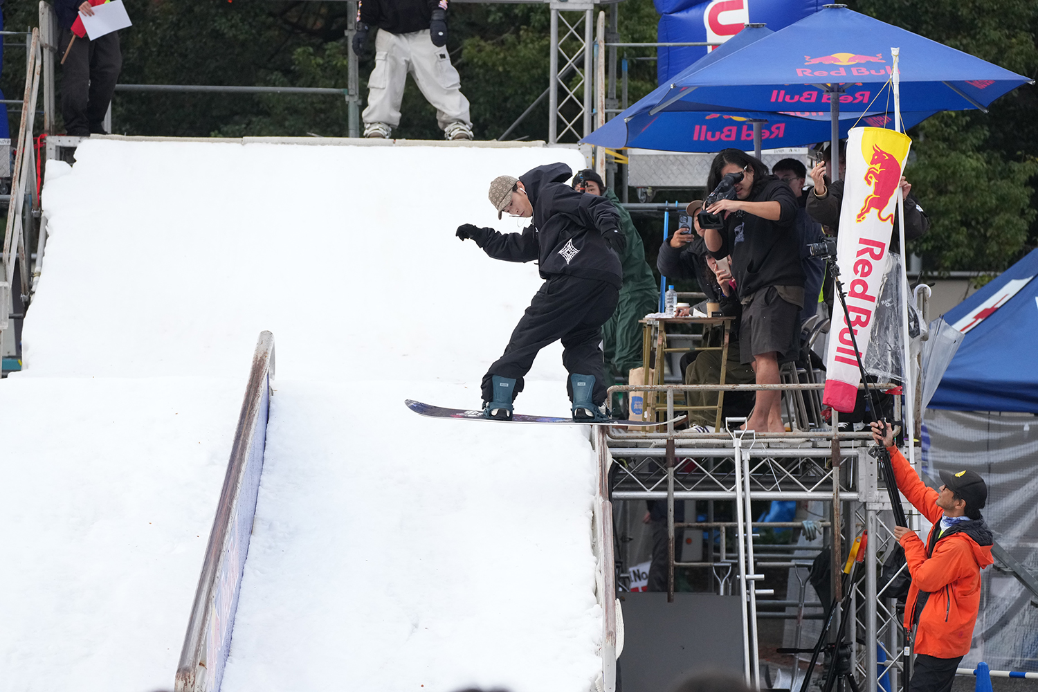 この日は参加選手としての出番がある千葉真人にかわり、石川敦士&ミヨンのジャッジチームと合流したのは自身もSNOWBANKで様々な伝説を築いてきた小川凌稀。