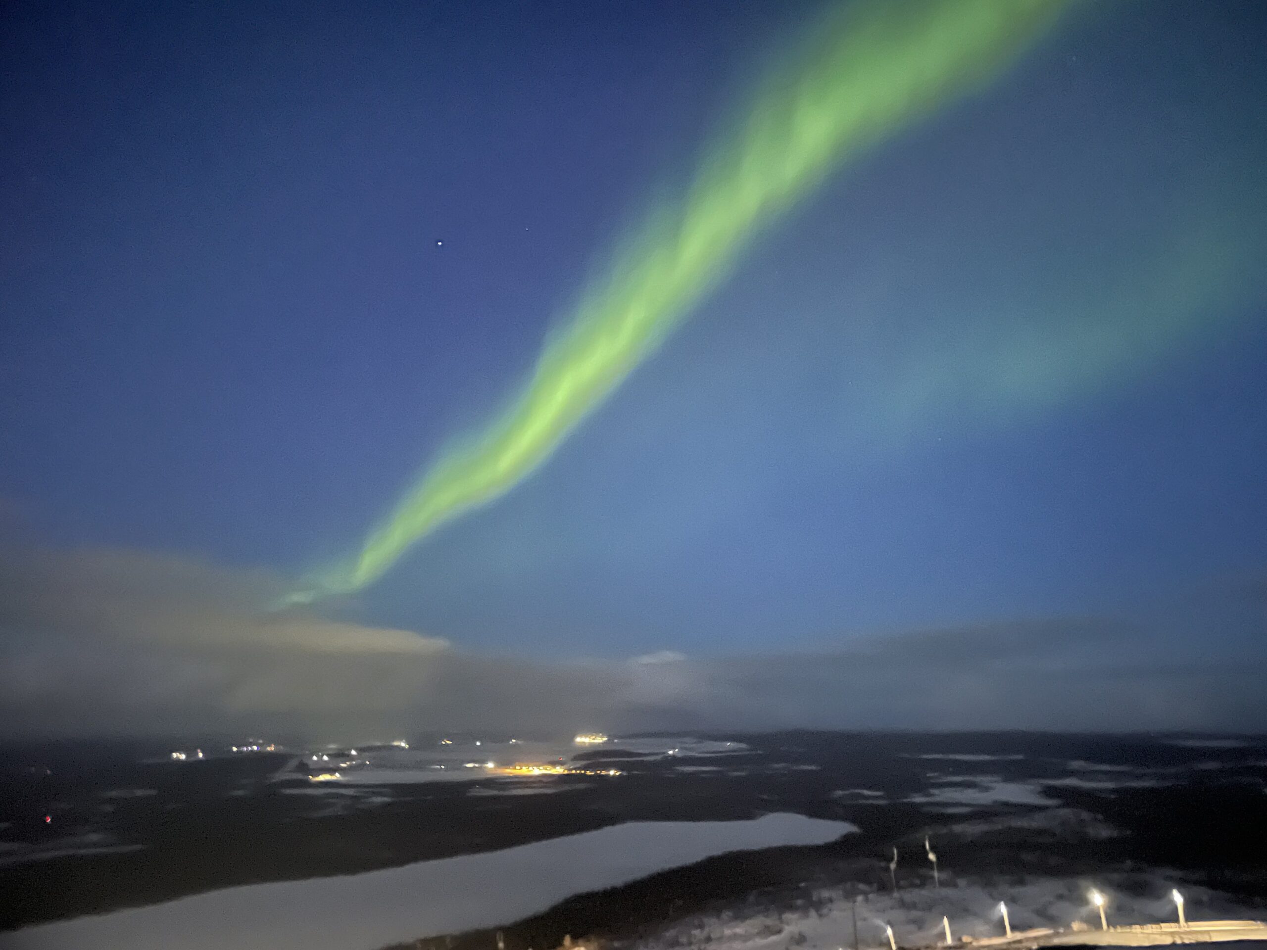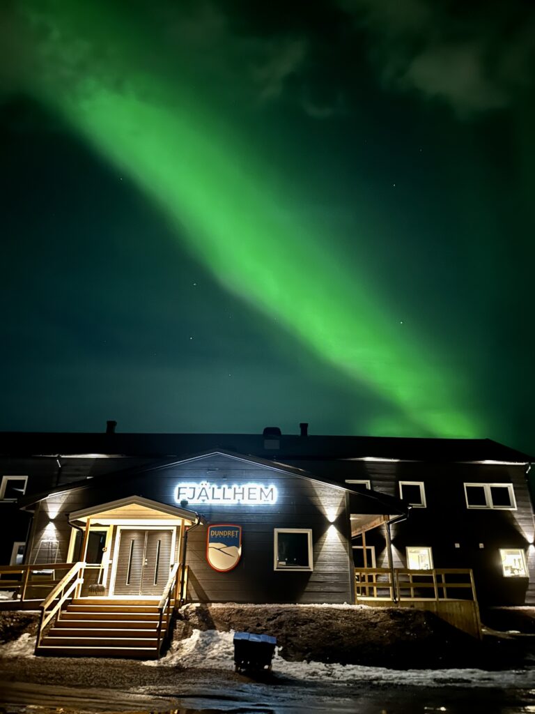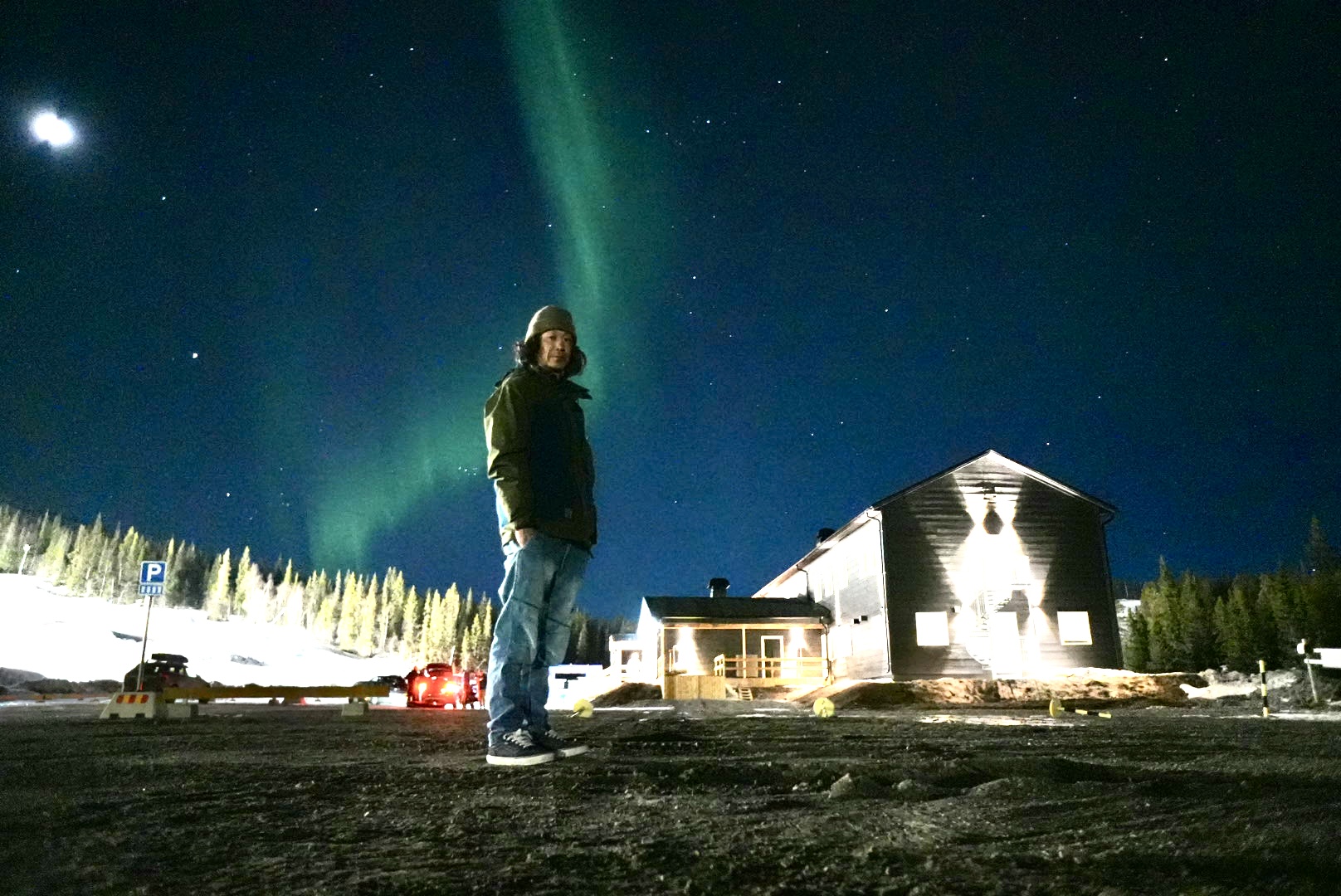 ゲストハウスは新しく清潔で、窓の向こうにゲレンデ、別棟にはサウナ。共同キッチンは広く、調理台も使いやすい。まずは食料とビールの確保に歩き出す。GPS上は徒歩10分でも、体感は倍。広大な地面と空のスケールが、時計の進み方をゆっくりに変えていく。戻ればサウナ→外気浴→簡単な煮込み→ビールの導線が完璧にハマる場所だろう。夜、外へ呼び出されて空を見上げると、いきなりのノーザンライト。到着初夜に願いが一つ叶ってしまい、旅の不安が霧のように消えた。
