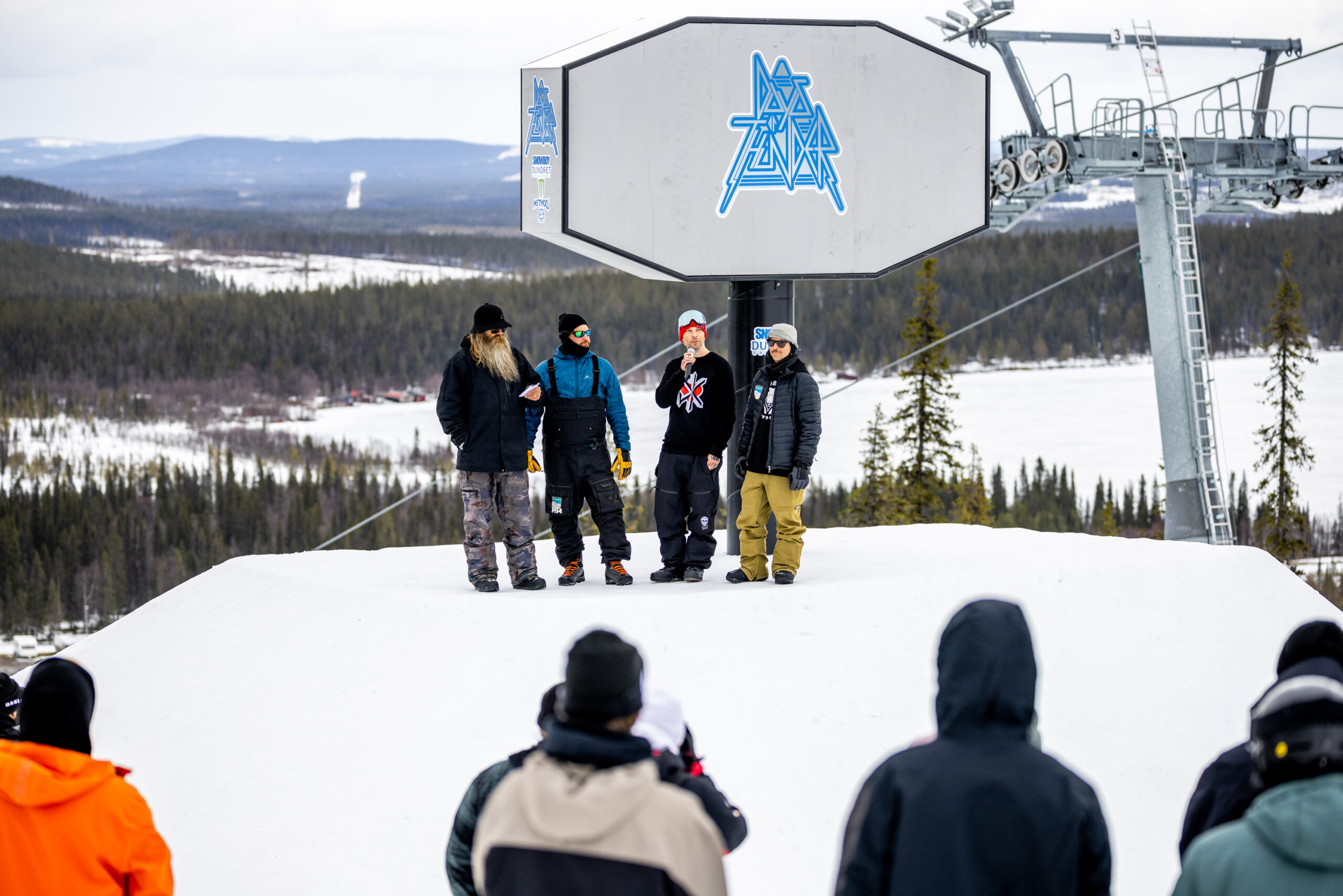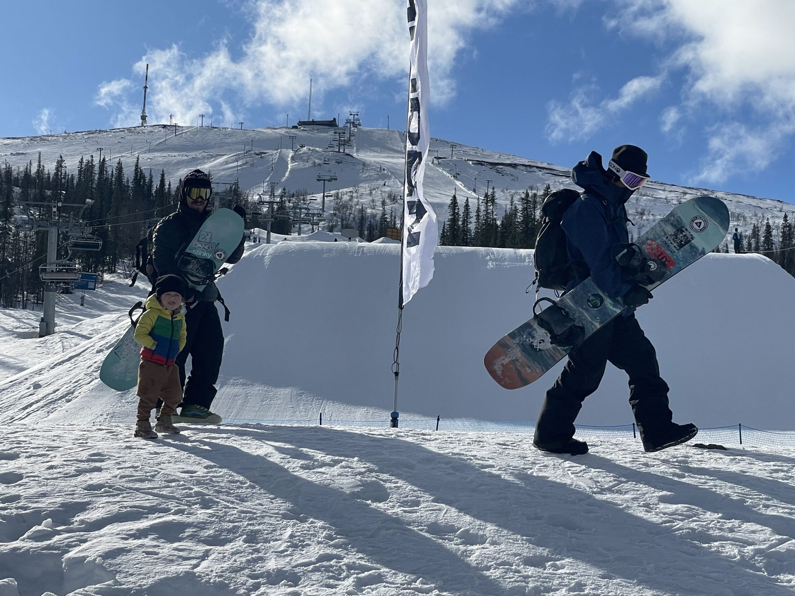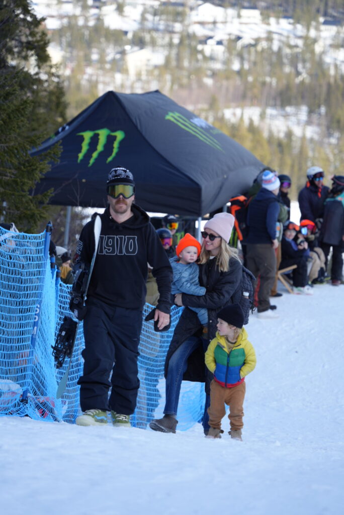 昼を挟んで、外からの“見学者”がどんどん増える。スウェーデンはスキーヤーが圧倒的多数で、スノーボーダーは少数派。だからこそ、外から来たライダーが一本流すだけで、思っている以上の拍手と歓声が届く。地元の人は滑らない、むしろ“観るために来る”。ライダーたちの技術や発想が、目の前の金色のウォールで現実になる様子に、子どもも大人も素直に興奮しているのが伝わる。