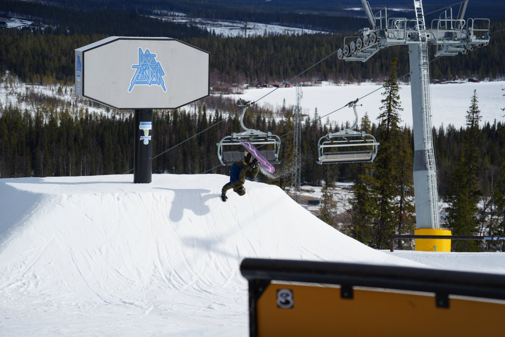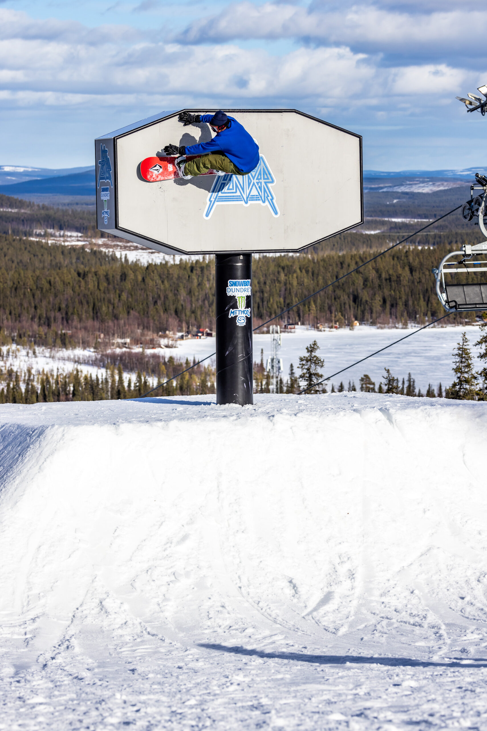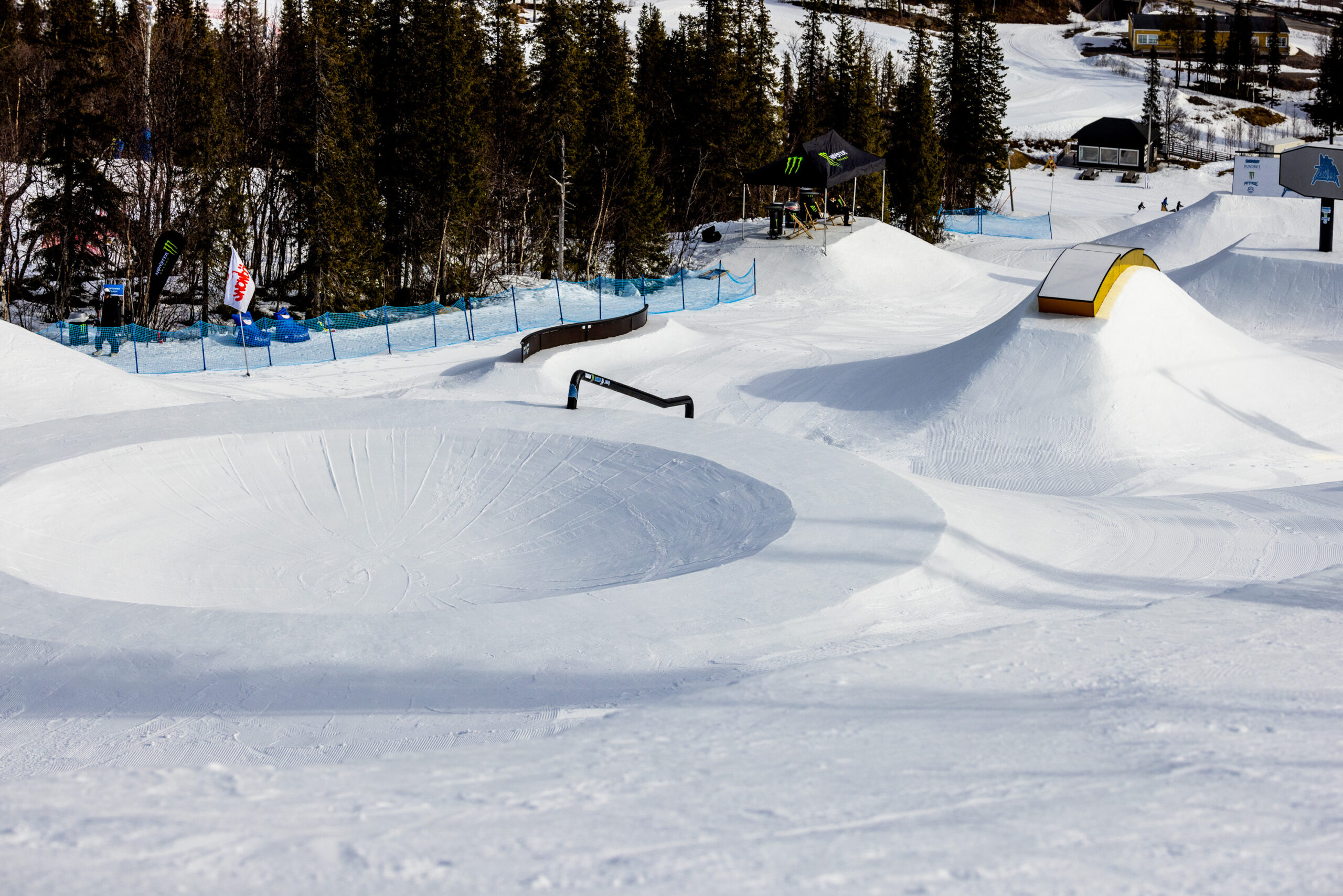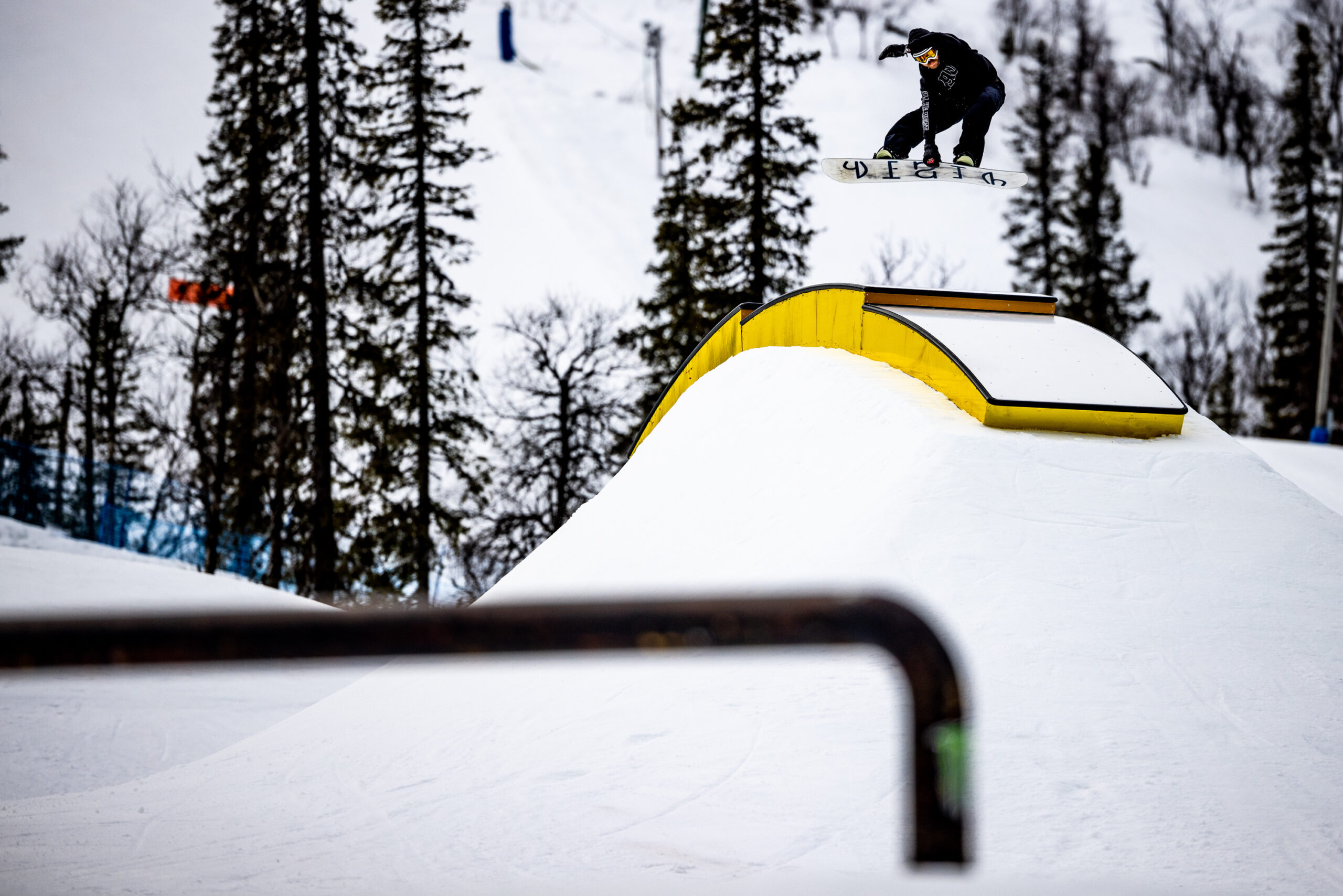 イベント初日。受付はスウェーデン語と英語のチャンポンだが、要るのは細かいルールではなく“遊ぶ意思”だ。今季のこの地域は記録的な雪不足で、積雪は20cmほど。ピステンはスケートリンク並みに硬く、カービングで雪面を削るどころか、凹凸の上を「浮いて落ちていく」ような不思議な感覚すらある。ゲレンデは中央にリフトとTバーが一本ずつ。ピークから左右の緩い尾根へ振り、ボトムで中央に戻る“コンパクト設計”だ。ノルディックスキーのコースはいくらでもあり、足を延ばせば相当遠くまで行ける。会場はゲレンデの真ん中くらいから直線的なパークが出現。そこのパーク内で軽く遊んでいるとイベント会場が出てくる。セクションは、アーチボックス、Sレール、巨大な足のついたウォール。特設会場内の地形は、雪質が硬いのと雪不足のせいなのか全体的に丸みがありハードには感じなかったのでカービングターンで気持ちよくクルーズは可能だ。どこからでも入れる導線で、レベルもスタイルも違うライダーが同じ特設パークを共有できる。アイテムの主色に金が使われているのは、ここが鉱山の街で“金色が好き”というローカルの感覚へのリスペクトでもある。