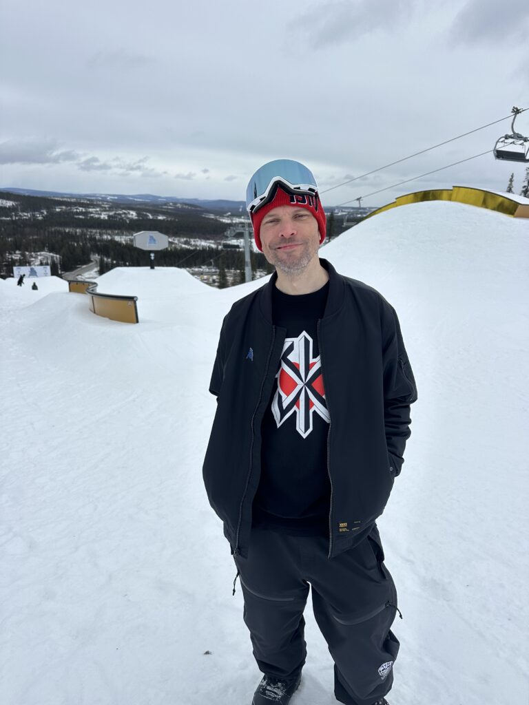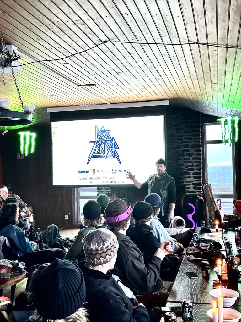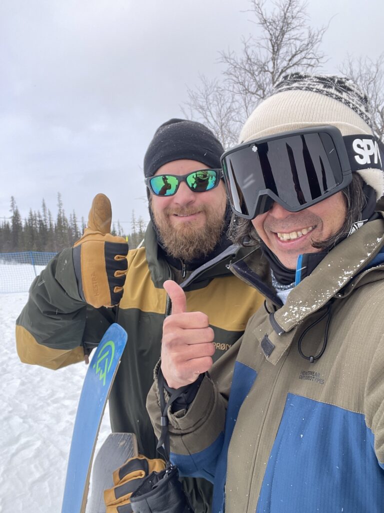 ストックホルムからさらに北へ、国内線でイェリヴァーレへ。空港を出れば、白樺と針葉樹の低い森が地平線まで続き、空の高さと空気の軽さが、ここが北極圏の縁であることをすぐに教えてくれる。目的地のDundret Gallivareは標高約800m。巨大な山塊の“絶景”ではないが、音が遠くまで抜ける静けさと、光が薄く滑るように移ろう感じが、この土地のスケールを雄弁に物語る。今回の渡航理由は、Snowboy Productionsが世界各地で手がけるコミュニティイベント「Days of Thunder」への参加だ。DEATH LABELのスウェーデン・チームライダーで、長年の仲間でもあるピージェイ・ ガスタスソン(以下PJ)が地元ホストを務め、アメリカからはフットワークの軽さと“しゃぶしゃぶ愛”でおなじみのアンドリュー・ブリュワーも合流する予定。会場づくりの最中に迎えに現れた“地元の大男”の正体は、90年代のレジェンド、ヨハン・オロフソン。地元の空気にレジェンドの体温が混ざった瞬間、旅の密度は一段上がった。