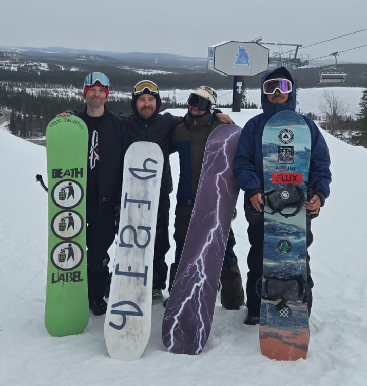 引き金になったのは2025年2月22~23日、川場スキー場で行われたSnowboy主催の「Mochiyori」。DEATH LABELの日本チームに、スウェーデンからはPJ、USAからはアンドリューが合流。会場には海外勢も多く、誰かがオニゴロシのパック酒をストローで吸って「うまい!最高!」と笑っている。そんな祝祭の熱の中で切り出されたのが、「今年PJ主催でスウェーデンでもSnowboyをやる。行く?行かない?」という直球の問いだった。僕の答えはシンプルだ。「PJが主催だし、大川さんも行くなら行くに決まってる。家族だから」。こうしてスウェーデンでの「Days of Thunder」への参加が決まる。以降の旅の段取りは“完全ローカル”のPJに丸投げ。日本に来た彼に、僕らができる限りの日本を見せてきたつもりだ。その“恩返し”を受ける番が来たのだと思えば、期待しかない。だが… 、出国1カ月前に僕は肋骨をやってしまい、反省と回復に全力投球することにもなったのだけれど…。