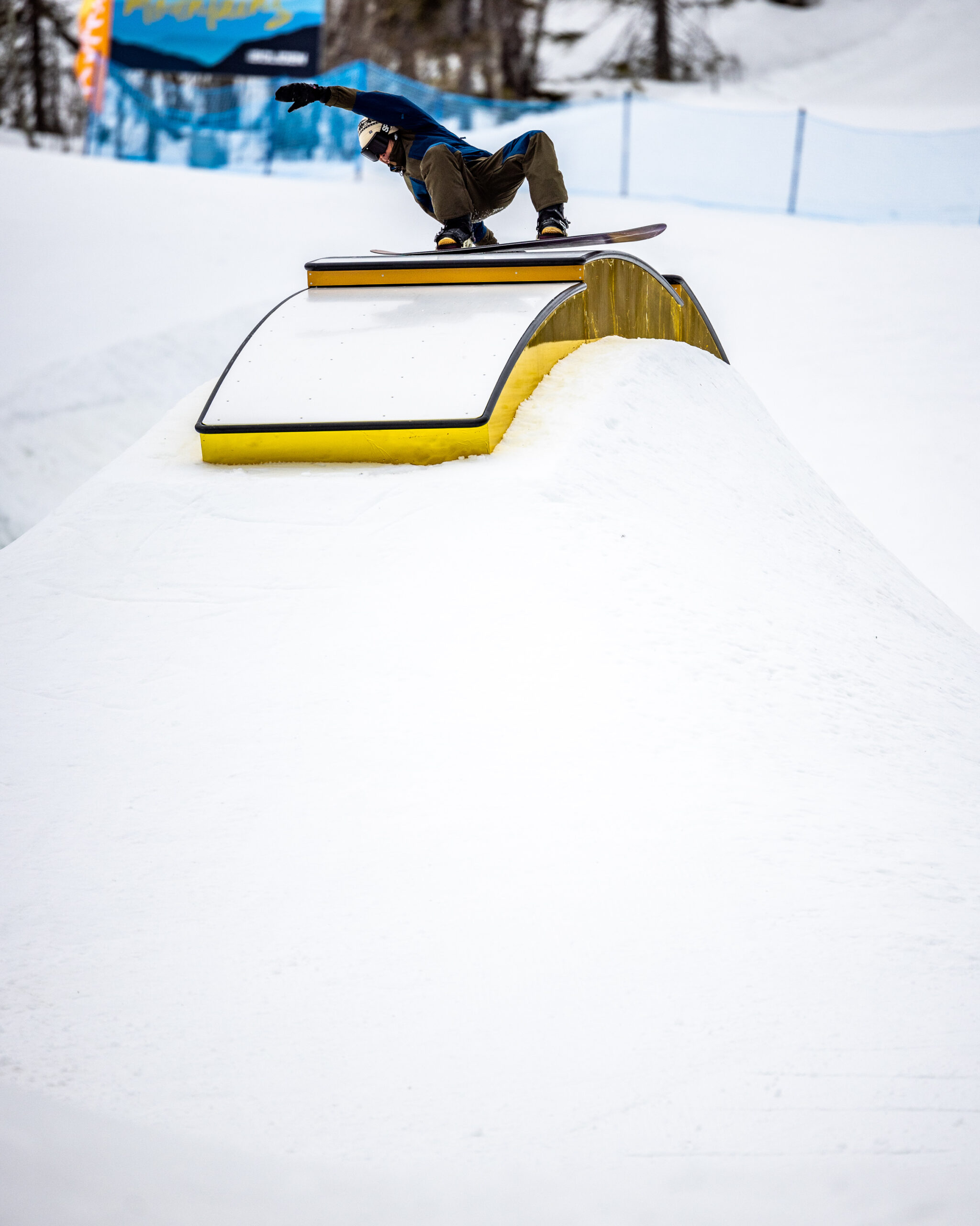 最終日、天気はついにピーカン。ただし雪面は依然として硬い。中央にチェア、脇をTバーが支えるコンパクトなゲレンデだからこそ、視線が自然に集まり、拍手と歓声がライダーへ一直線に届く。国や世代をまたいだ「顔の見える祝祭」。Snowboyの良心はまさにここにある。円形セクションで速度と角度を作り、Sレールで“通す”か、横振りでサイドヒットへ流し、中央の金色アーチボックスへ。直線で貫くもよし、横にほどいて描くもよし。同じキャンバスに違うラインを共存させる設計は、雪の量が少ない年でも“遊び方”を減らさない工夫だ。